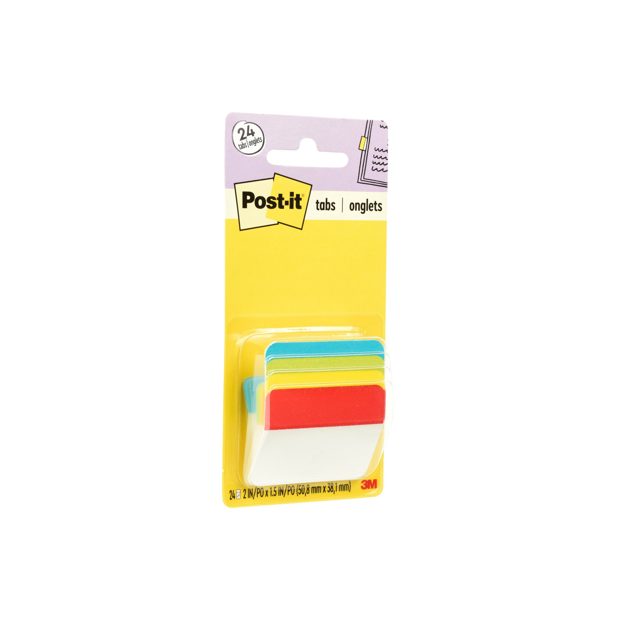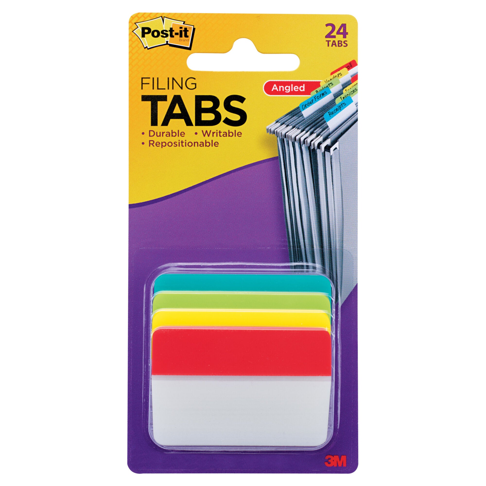 Post-it Filing Angle TABS organize and label hanging files folders and according files quickly and easily. Tough and long-lasting - stand up to repeated use. Large, easy to write on space which aids in organizing information quickly. Contains 4 pack of Post-it 2 in Angled Filing TABS in Assorted Primary colors, 24 total TABS.Post-it® Tabs in 2 inch size create necessary order by easily creating sections in planners, binders and calendars. Color bars give you flexibility to organize by color but also write on them, and reposition as needed. Tabs are durable. They are also great for planners, binders and file folders. Tabs stick securely and remove cleanly. Color code hanging files folders and according files quickly and easily. Large, easy to write on space which aids in organizing information quickly. Contains 4 pack of Post-it® 2 in. Angled Filing Tabs in Assorted Primary colors, 24 total TABS.