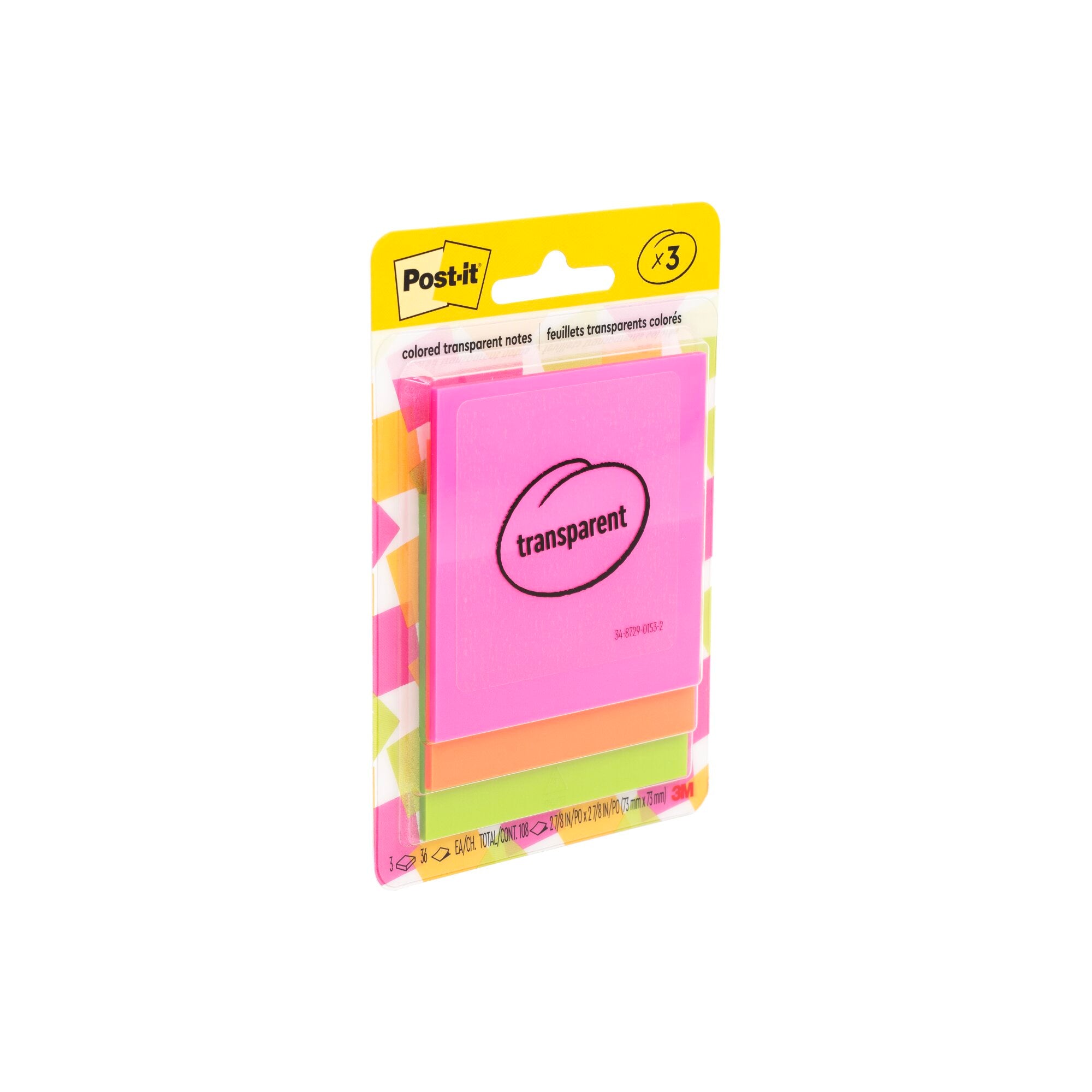 Post-it® Transparent Notes, Assorted Colors, 2.8 in. x 2 .8 in., 3 Pads/PackPost-it® Transparent Notes in assorted colors are clear notes for use in books, crafts or other projects where you need to make notes on items and see underneath easily. The standard 2.8 in. x 2.8 in. size is great for making notes in textbooks, as you can see through to highlight or call out specific content. This pack includes pink, green and orange transparent sticky notes. Use to color code your notes or subjects, or use for crafts to trace images or patterns from other items. And like all Post-it® Products, these notes feature a unique adhesive designed for paper that removes cleanly without damage, so you can remove the notes when done with no worries. Post-it® Transparent Notes come in 3 Pads/Pack, 36 Sheets/Pad.