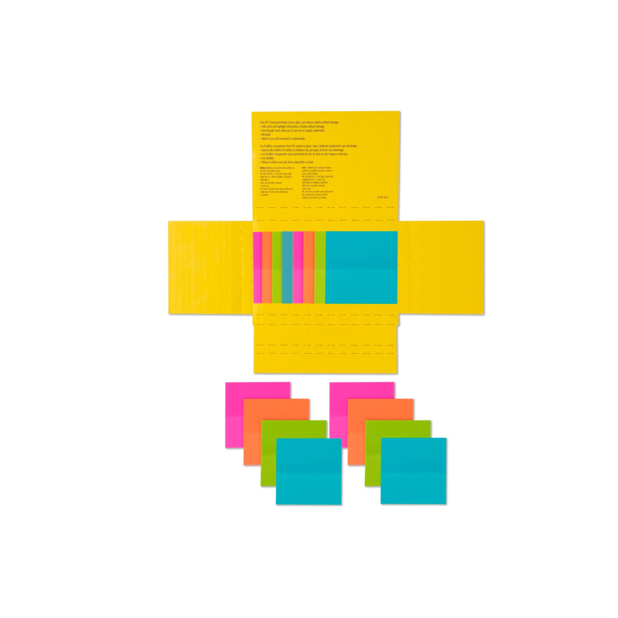 Post-it® Transparent Notes, Assorted Colors, 2.8 in. x 2 .8 in., 8 Pads/PackPost-it® Transparent Notes in assorted colors are clear notes for use in books, crafts or other projects where you need to make notes on items and see underneath easily. The standard 2.8 in. x 2.8 in. size is great for making notes in textbooks, as you can see through to highlight or call out specific content. This pack includes pink, orange, green and blue notes. Use to color code your notes or subjects, or use for crafts to trace images or patterns from other items. And like all Post-it® Products, these notes feature a unique adhesive designed for paper that removes cleanly without damage, so you can remove the notes when done with no worries. Post-it® Transparent Notes come in 1 Pad/Pack, 36 Sheets/Pad.