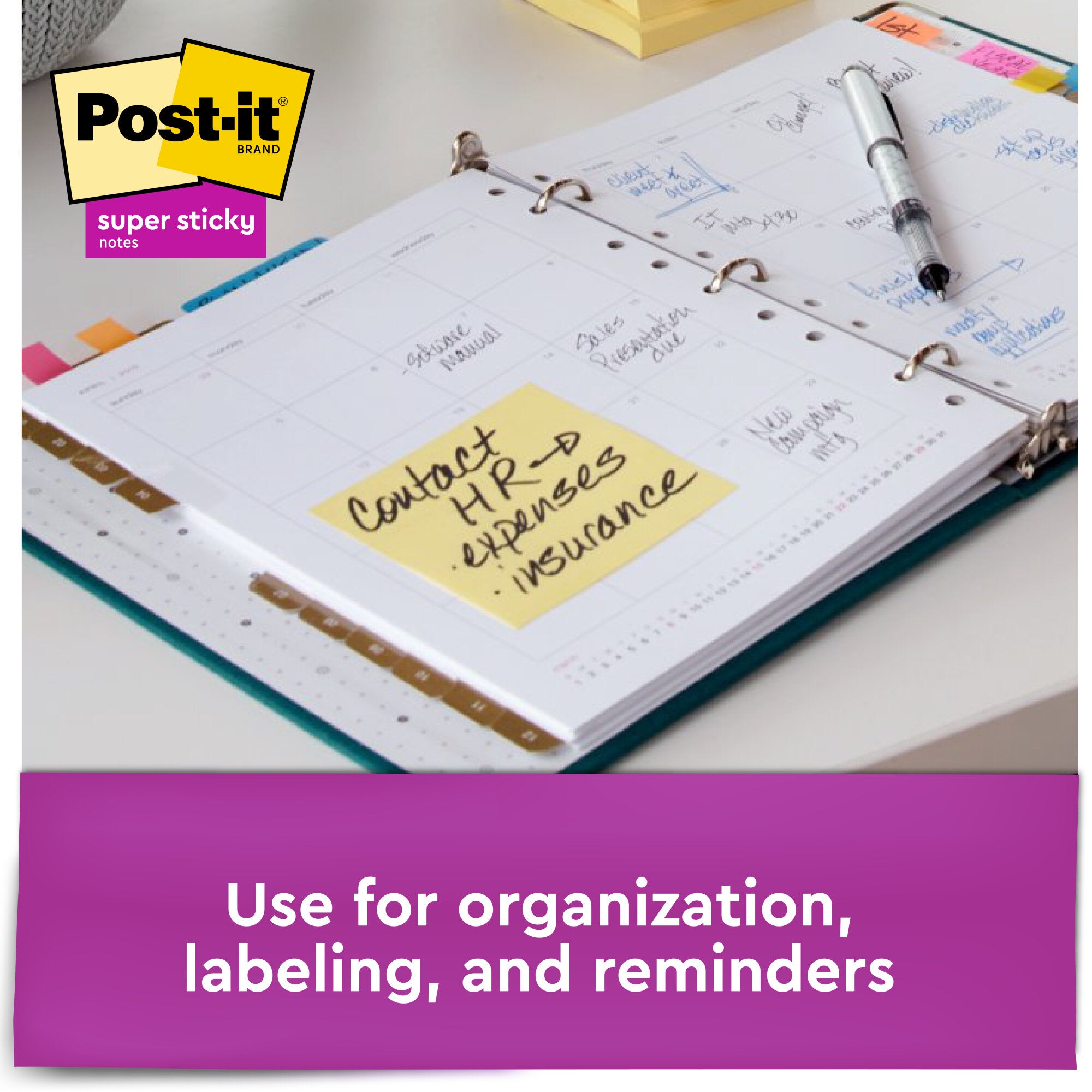 Post-it Super Sticky Notes Stick Practically Anywhere! Revolutionary adhesive technology ensures your notes will stick securely to more surfaces. Now you can stick your notes where they will really get noticed...like monitors, doors and walls!Post-it Super Sticky Notes in 2 in x 2 in feature 2x the sticking power. Use for short notes or reminders on doors, windows or walls. Unique adhesive reliably sticks and re-sticks so your message can stay front and center. Move your notes with you throughout the day. Classic Canary Yellow color helps your note break through. Post-it Super Sticky Notes are recyclable and the paper in Post-it Super Sticky Notes is sourced from certified, renewable and responsibly managed forests. 10 Pads/Pack, 90 Sheets/Pad.