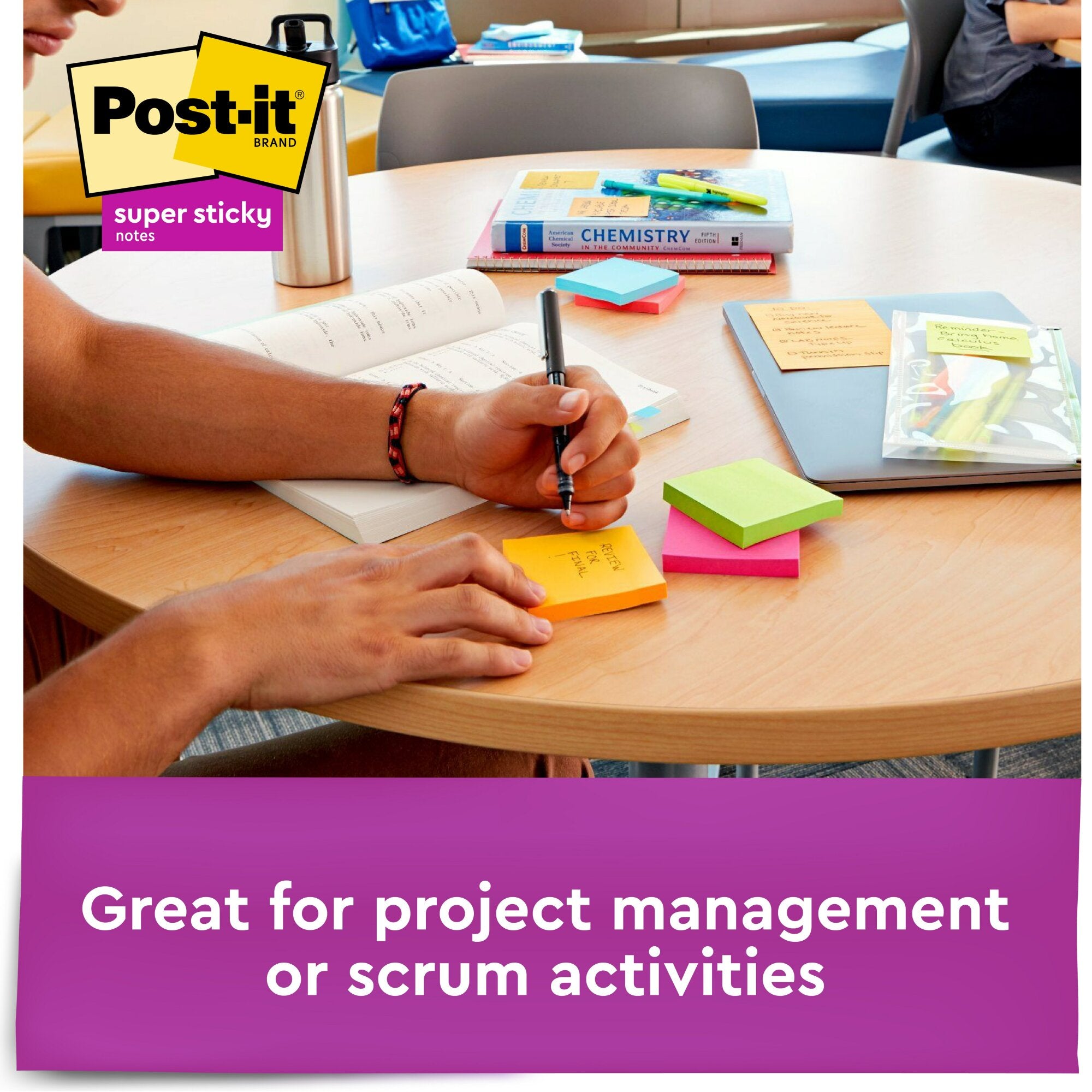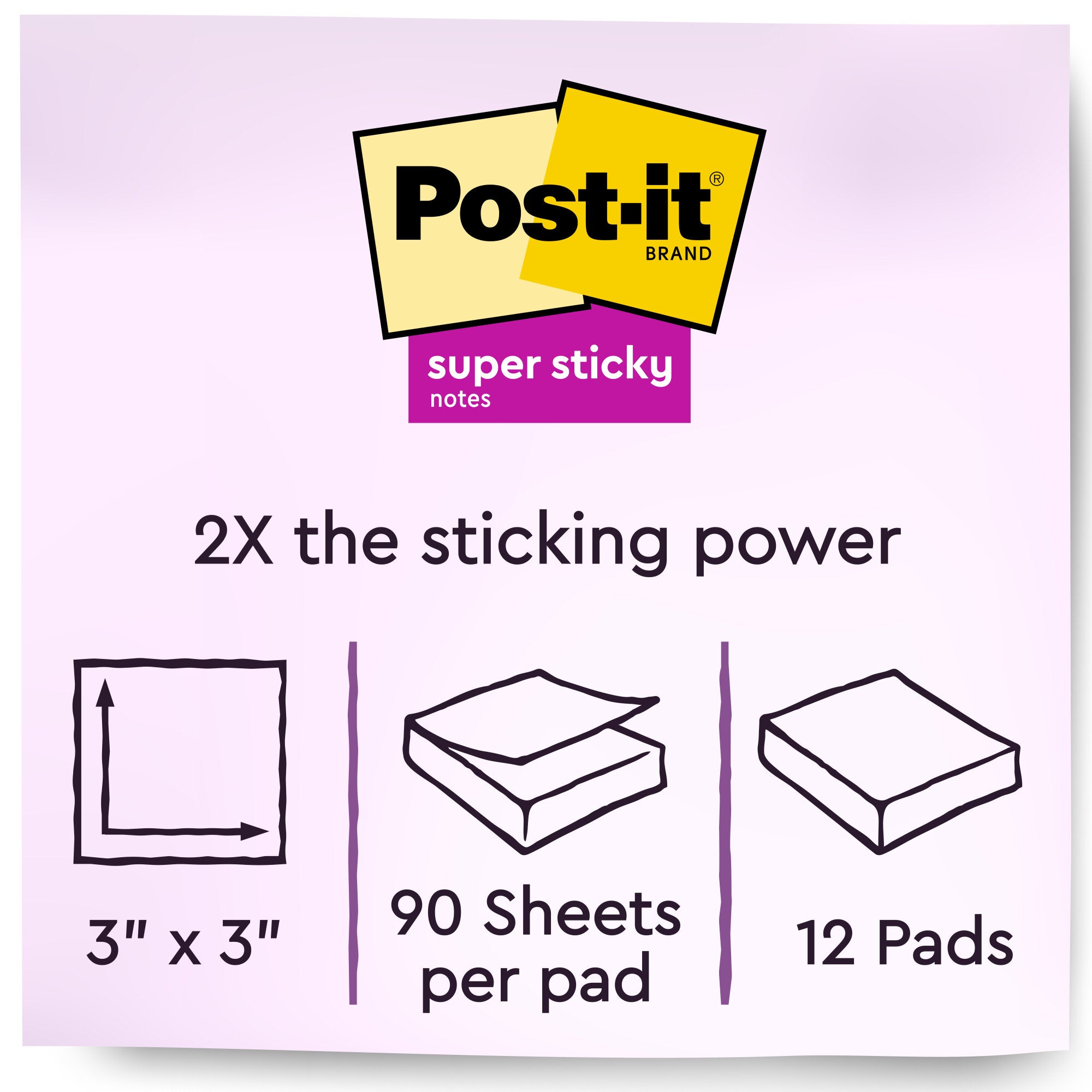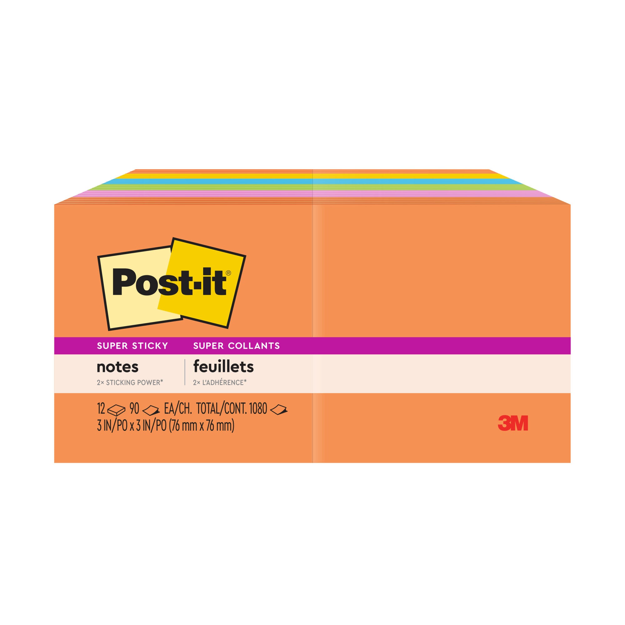 Post-it Super Sticky Notes in 3 in x 3 in feature 2x the sticking power.Uplift your spirits and messages via the vibrant, strong colors of the Energy Boost collection. Whether jotting down your daily to-do's, brainstorming big ideas, studying or setting reminders, colors and ideas are always brighter together. These sticky notes feature 2X the sticking power. They also stick and re-stick - allowing you to move your notes with you throughout your day. They’re ideal for walls, doors, windows and other vertical surfaces, and like all Post-it Notes, they stick securely yet remove cleanly without damage. Keep your ideas across your notebooks, classroom books, calendars or other documents. No tape or tacks are needed with adhesive notes, saving you money and time on office products or school supplies. A great memo pad, these are ideal for using for notes or reminders to yourself or others. Post-it Super Sticky Notes are the perfect solution for shopping lists, reminders, notes on computer screens, time tracking, to-do lists, marking cables, color-coding documents, reminding kids to do chores, storyboarding, scratch paper and agile processing. Each notes sheet is approximately 3 in. x 3 in., with 90 sheets per pad and 12 sticky note pads per pack. These colorful sticky notes include colors from the Energy Boost collection including orange, pink, yellow, blue and green. All Post-it Notes are sourced from certified, renewable and responsibly managed forests, and all Post-it Notes are recyclable, so you can recycle them when they are no longer needed.