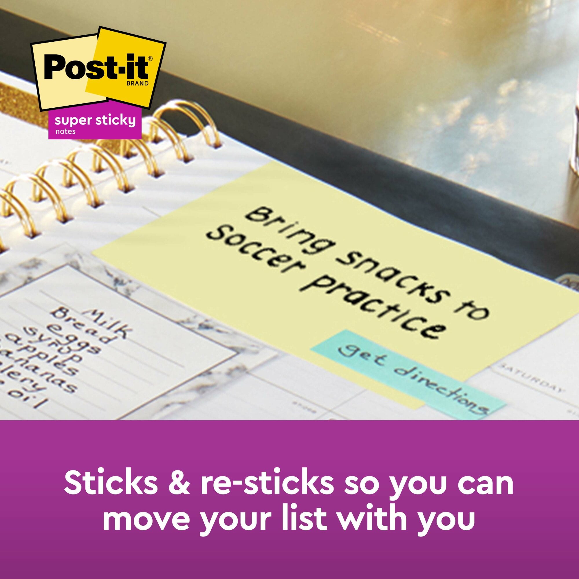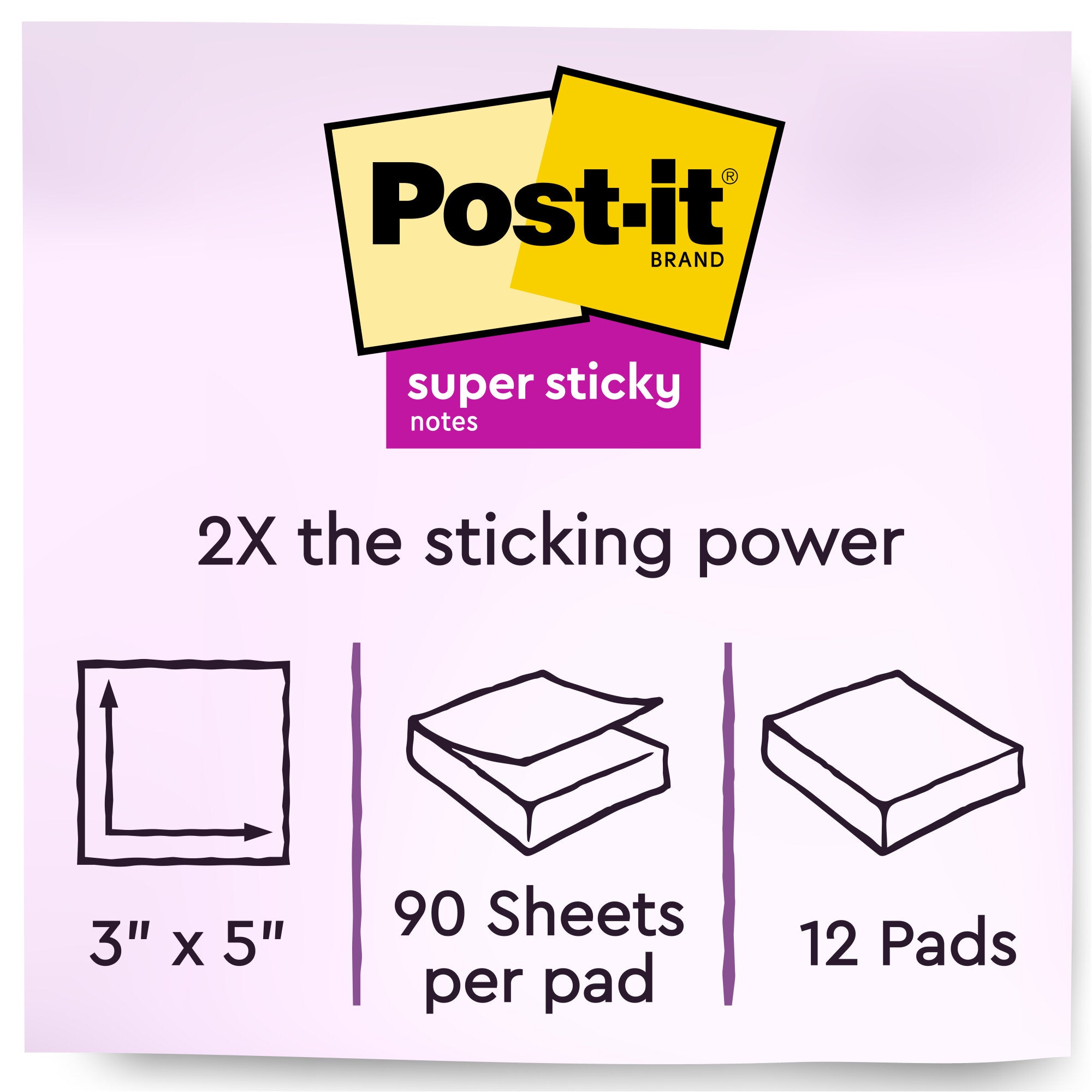 Post-it Super Sticky Notes Stick Practically Anywhere! Revolutionary adhesive technology ensures your notes will stick securely to more surfaces. Now you can stick your notes where they'll really get noticed...like monitors, doors and walls!Post-it® Super Sticky Notes in 3 in. x 5 in. feature 2x the sticking power. Use for short notes or reminders on doors, windows or walls. Unique adhesive reliably sticks and re-sticks so your message can stay front and center. Move your notes with you throughout the day. Classic Canary Yellow color helps your note break through. Post-it® Super Sticky Notes are recyclable and the paper in Post-it® Super Sticky Notes is sourced from certified, renewable and responsibly managed forests. 12 Pads/Pack, 90 Sheets/Pad.