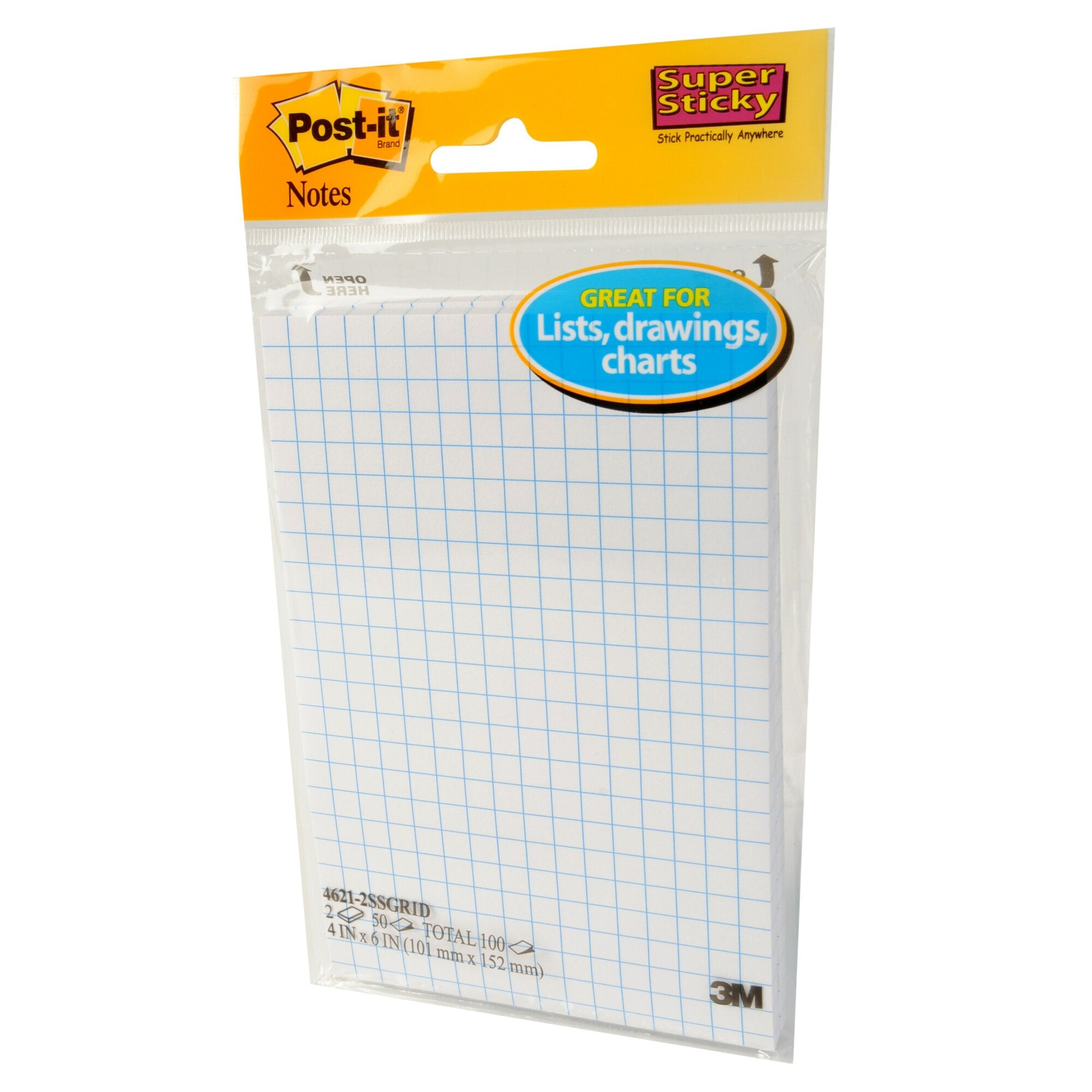 Post-it Super Sticky Notes feature 2X the sticking power. With these notes you can stick and re-stick to move reminders and to-dos with you throughout the day.Post-it® Super Sticky Notes in 4 in x 6 in feature 2x the sticking power. White notes with blue grid-lines notes are great for techies, teachers and students. Move your to dos with you throughout the day. Great for sketches or to keep to-do lists organized. Post-it® Super Sticky Notes are recyclable and the paper in Post-it® Super Sticky Notes is sourced from certified, renewable and responsibly managed forests. 2 Pads/Pack, 50 Sheets/Pad.