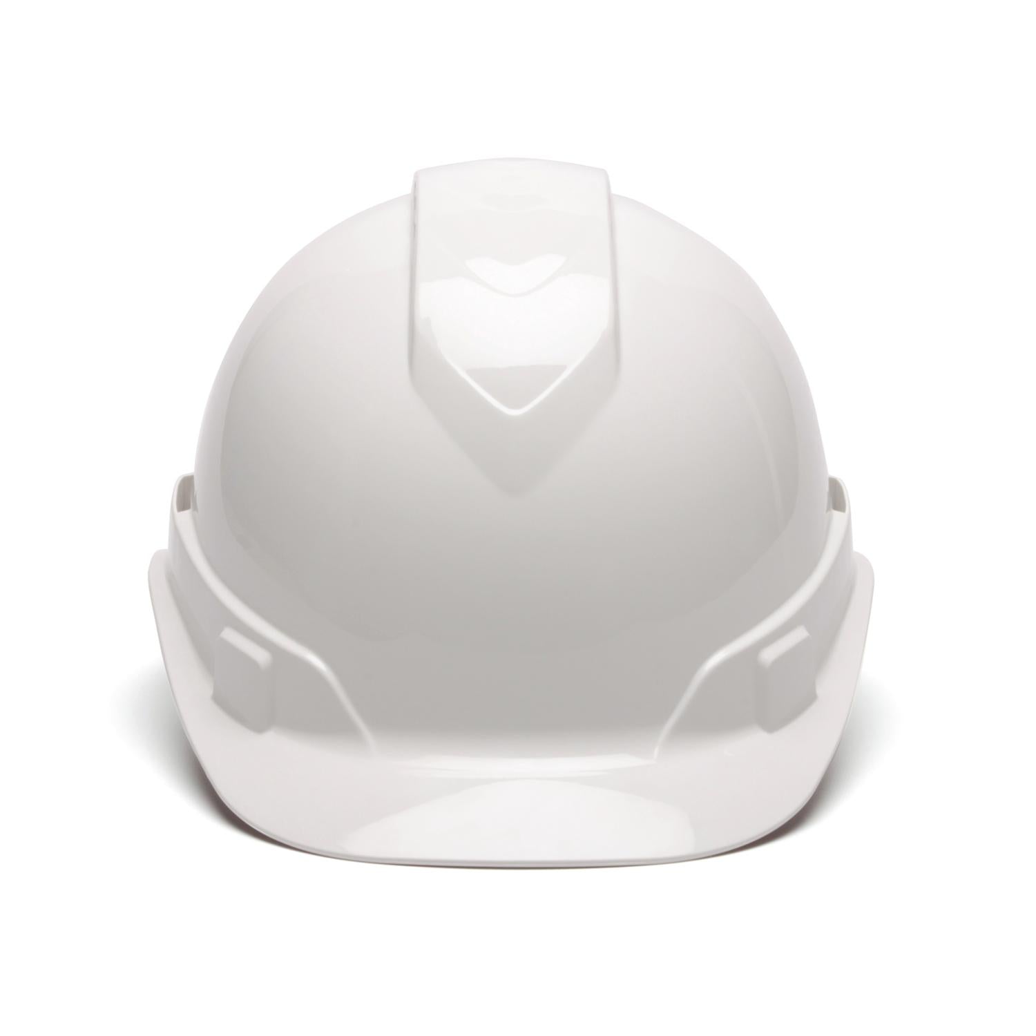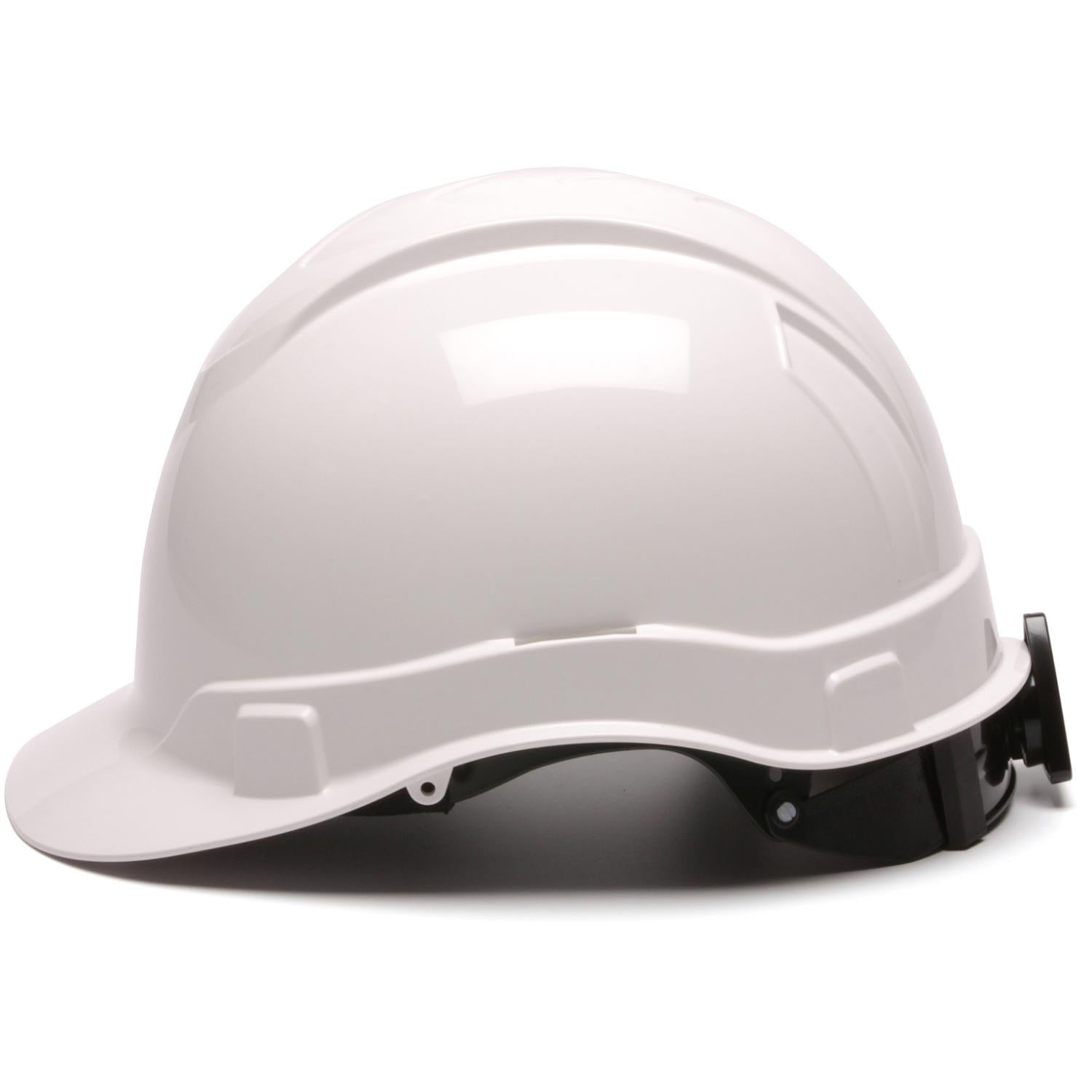 Pyramex - Ridgeline Hard Hat - White-Ridgeline Cap Style 6 Pt Ratchet Suspension - The Ridgeline is made from ABS material, this thermoplastic resin is a lightweight material that combines strength and rigidity. Low profile design offers a low center of gravity for better balance. Rear padded suspension provides additional level of comfort on the wearers' neck. Vented pressure pad keeps the straps in place providing an additional level of comfort. Easy to grasp triangle knob adjusts the suspension from 6.5 to 8-inch hat sizes. Replaceable sweat band padded fabric and polyurethane foam for all day wear. 4-position harness points allows you to move the harness forward, backward, up or down-allowing for the most optimal position for ultimate comfort.