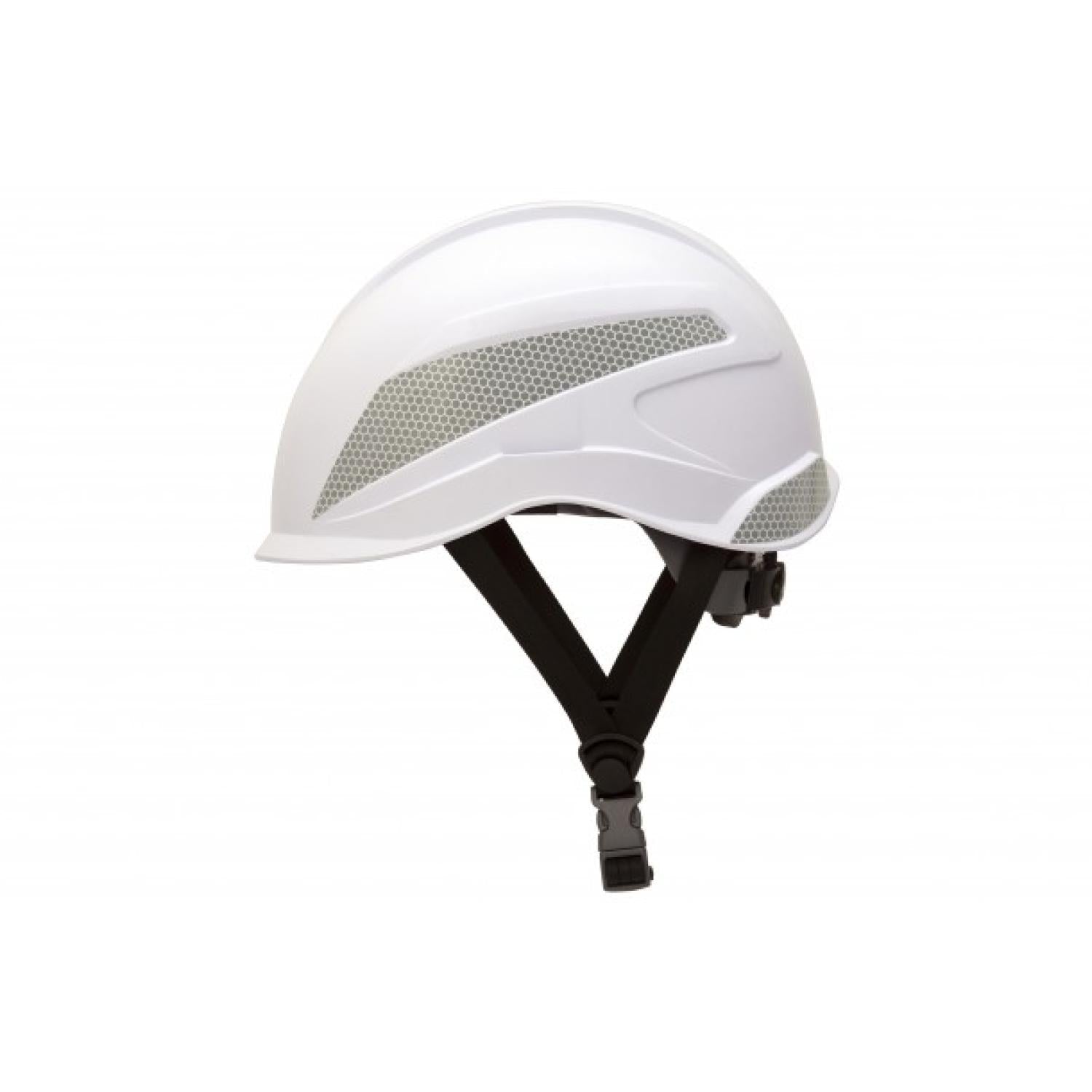 The Ridgeline XR7 Safety Helmet is made of ABS/PC material that provides superior strength and higher heat resistance. This lightweight safety helmet features a 6 point ratchet suspension and is easily adjustable from a hat size of 6.5 to 8, as well as adjustable height settings and angles for wearing. The pressure pad and rear pad are soft and cushioned for all day wear. The comfortable headband is designed to prevent wrinkling. The swinging hinge point is easy to adjust to your preferred fit. The helmet attaches with a 4 point chin strap with a breakaway safety feature and sits comfortably under the chin while securing the helmet. The universal accessory slots fit cap mounted earmuffs and other accessories needed during your workday. This helmet meets the standards for ANSI Z89.1-2014, CAN/CSA Z94.1-2015. This safety helmet includes 4 reflective stickers that can be adhered to the helmet. Instructions are provided.