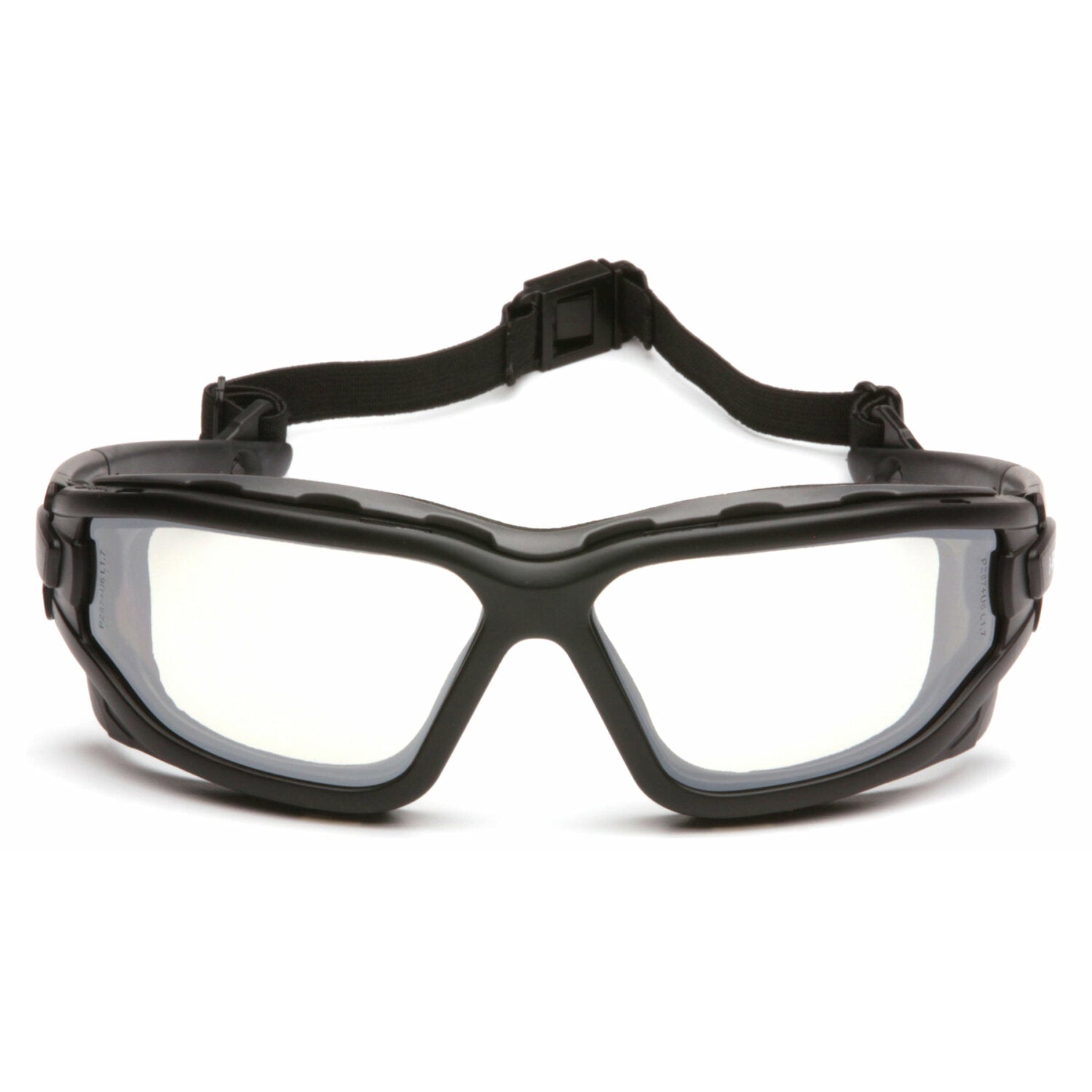 Pyramex - I-Force Slim - Black Strap-Temples/Clear Anti-Fog Lens - Sporty, lightweight design eliminates the bulkiness and weight of a goggle. Quick Release interchangeable temples and an elastic strap. Vented foam carriage provides maximum dust protection, as well as a sufficient airflow outlet for heat. An outer polycarbonate lens protects against the environment, while an inner acetate lens is designed to prevent fogging. Lenses provide 99% protection against harmful UV rays. I-Force Slim has all the great features of I-Force in a design better suited for smaller facial sizes.