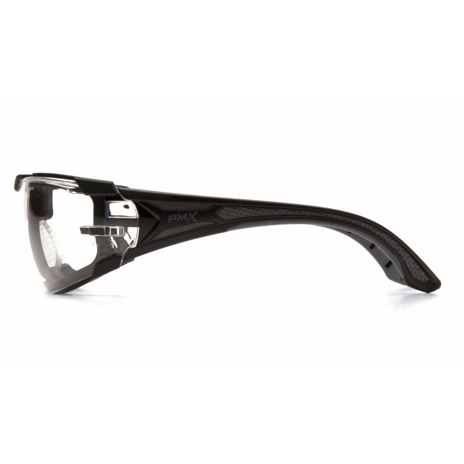 Pyramex - Endeavor Plus - Black-Gray Foam Padded Frame/Clear H2MAX Anti-Fog Lens - Lightweight & durable protective eyewear. Built-in brow guard shields against overhead particles. Special dielectric hinge design contains no metal parts. Curved, co-material temples allow for comfortable all day wear. Scratch resistant polycarbonate lens provides 99% UVA/B/C protection. 9.5 base one-piece wraparound lens provides excellent side protection. Soft and adjustable nose piece provides a customized fit to prevent slippping.