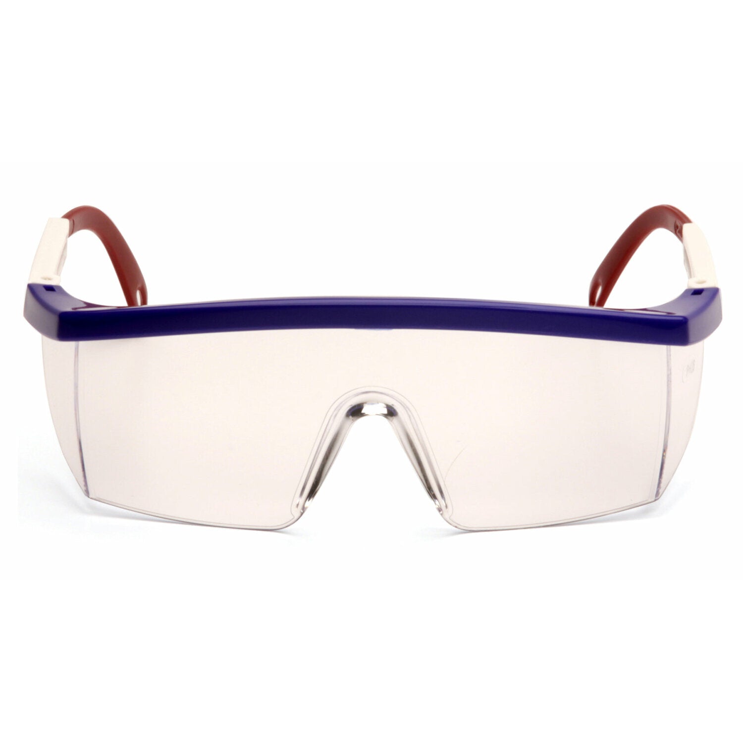 Pyramex - Integra - Red/White/Blue Frame/Clear Lens - Single lens and adjustable temples ensure reliable performance. Available in a wide variety of frame colors and lens tints. Select frames available with fog free coating. Lenses are coated for superior scratch resistance. Lenses provide 99% protection against harmful UV rays.