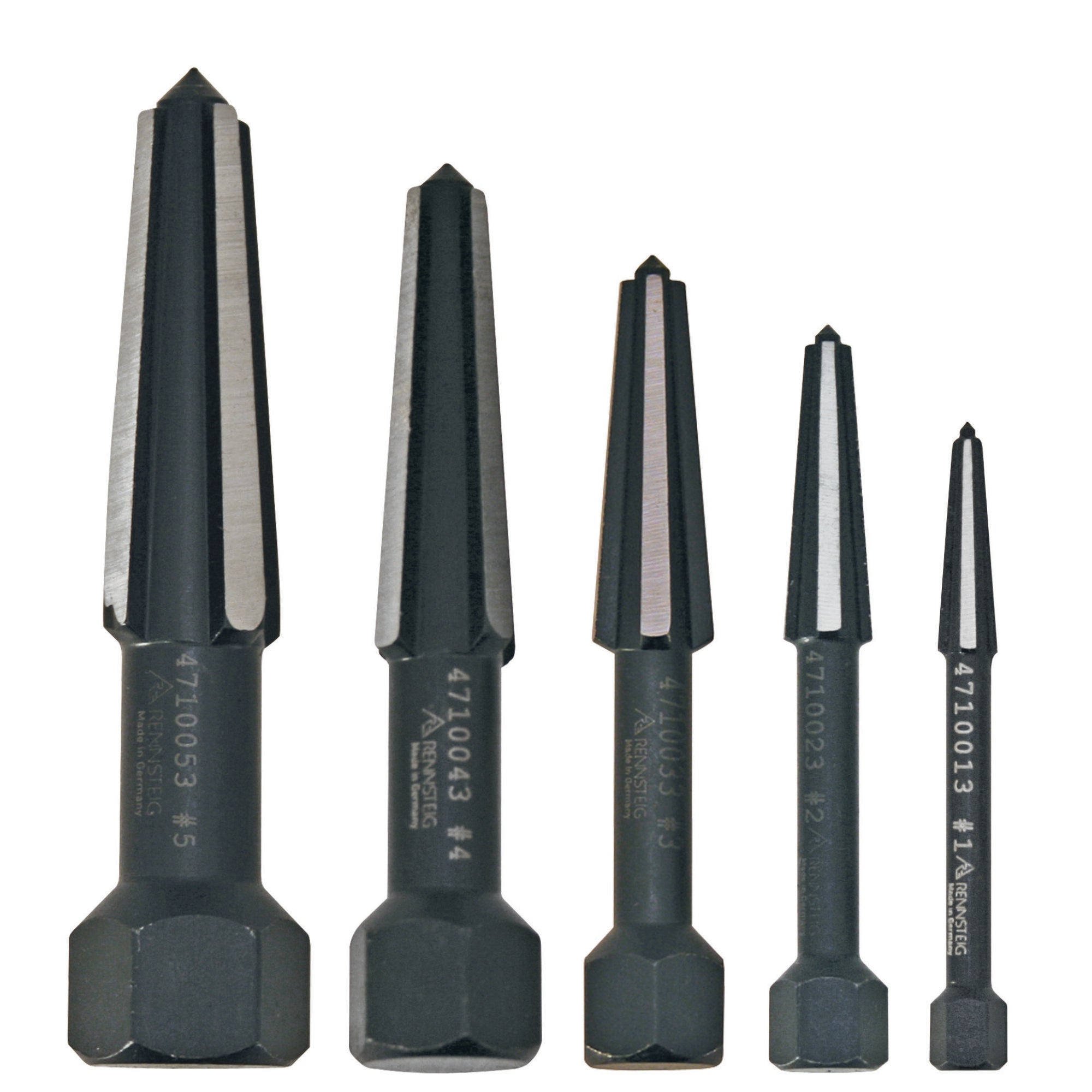 Non-slip and dual-edged engagement with the broken screw or bolt that needs to be removed. Unique hex head design works well with all standard hex sockets and extensions or box wrenches, eliminating the problem of rounded corners. Can be turned in clockwise or counterclockwise direction (for right-and left-hand threads). For unscrewing ruined screws and bolts without damaging threads. Tip has a built-in center punch pin to mark the center point. Drill a hole in the broken fastener with appropriate size drill bit. Tap extractor into hole and use a socket or wrench to loosen the fastener. Tapered flute design. Black-Oxide, cutting edges polished. Made of high-strength chrome vanadium steel. Includes 1 each of: Screw Extractor Double Edged Size 1 (9R 471 001 3), Screw Extractor Double Edged Size 2 (9R 471 002 3), Screw Extractor Double Edged Size 3 (9R 471 003 3), Screw Extractor Double Edged Size 4 (9R 471 004 3), Screw Extractor Double Edged Size 5 (9R 471 005 3).