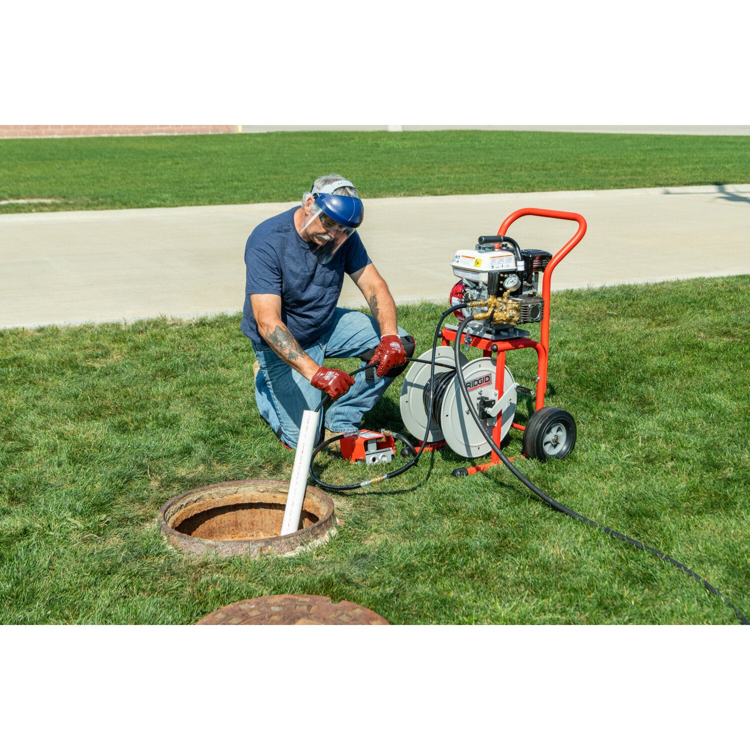 The KJ-2200 Gas Powered Jetter from Ridgid is a robust solution for drain cleaning, able to tackle tough blockages in lines from 1 1/4" to 6" in diameter. This complete unit comes with five nozzles, three hoses, and a convenient cart for easy transport. It features a powerful 6.5 HP gas engine paired with a duplex pump that boasts a corrosion-resistant brass head, ensuring quality performance and durability. The dual pulse action enhances maneuverability through bends while effectively cleaning at up to 2200 psi and 2.4 gallons per minute. Backed by a full lifetime warranty, it’s designed for reliability with minimal leak potential, keeping you on the job efficiently.
