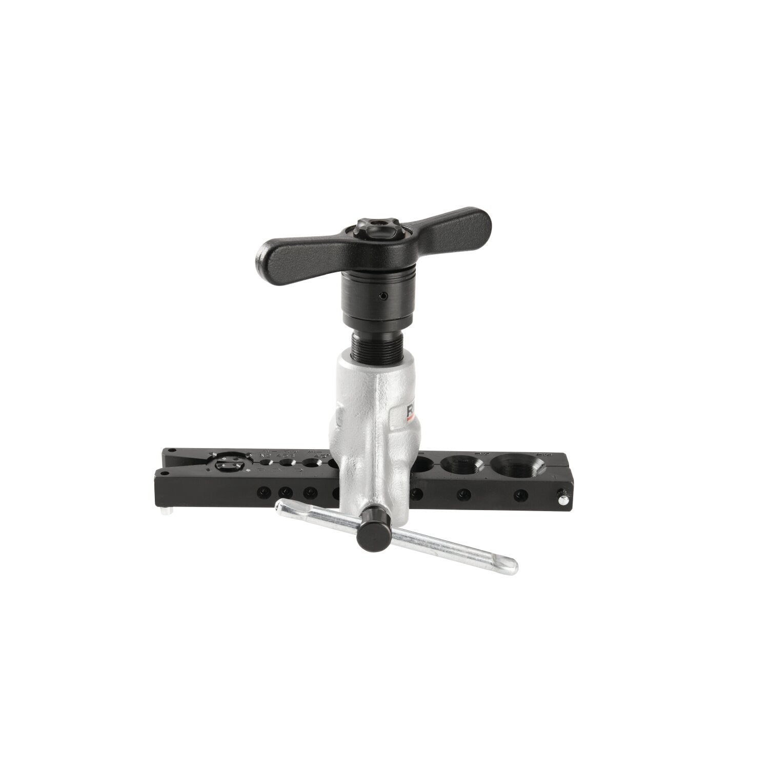 The Ridgid Precision Ratcheting Flare Tool is an essential addition to any professional toolkit, designed for creating precise 45° flares in steel, stainless steel, hard copper, and brass tubing. Its robust construction includes an eccentrically mounted hardened steel flaring cone for durability and a ratcheting handle that minimizes effort, making it particularly useful in confined spaces. The tool simplifies set-up, ensuring smooth flaring without additional stress, while its versatile capabilities cover sizes from 1/8" to 3/4". Enjoy peace of mind with a full lifetime warranty.