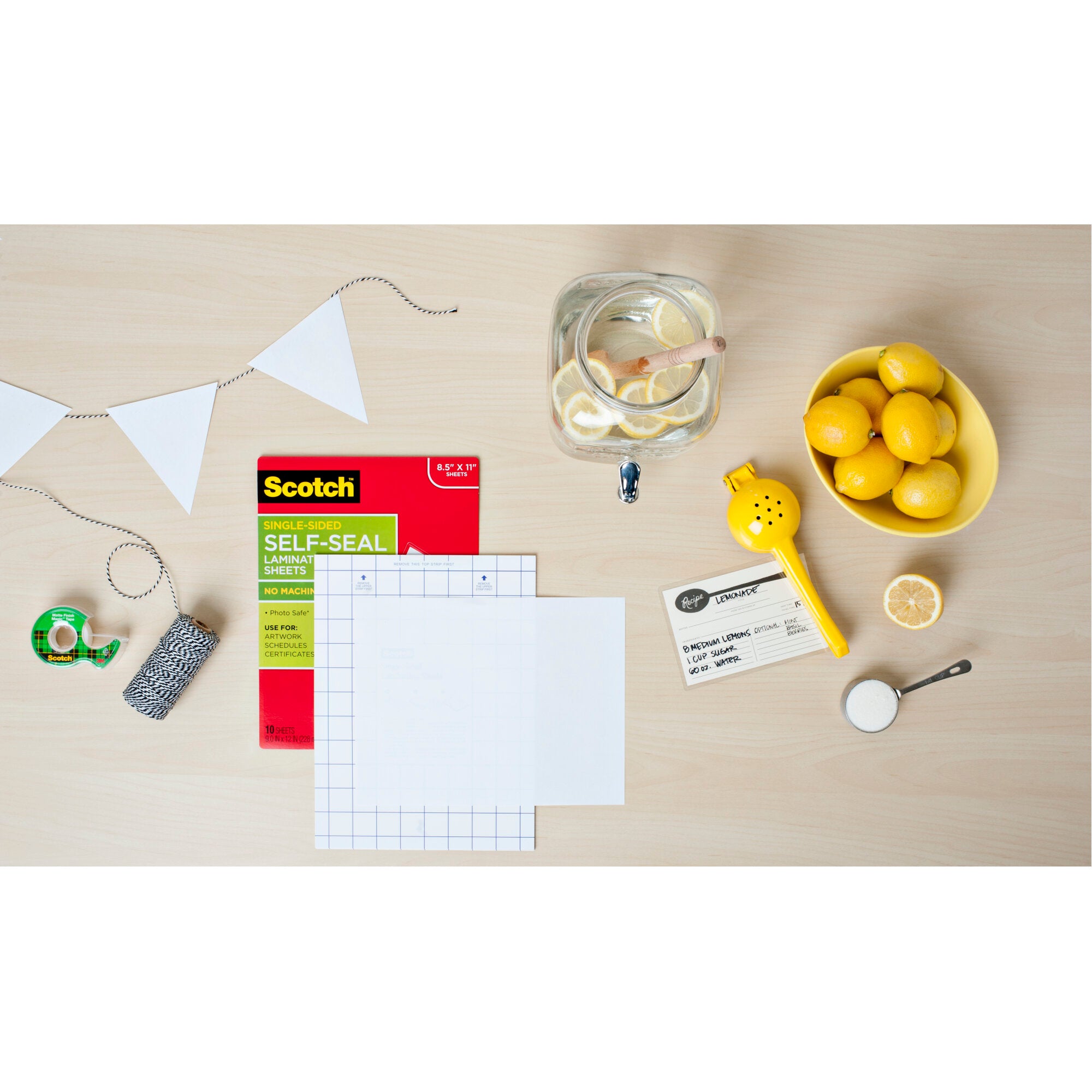 Scotch® Laminating Sheets LS854SS-50, 50 pack of Single Sided Laminating Sheets. 9 in x 12 in (228 mm x 304 mm) Letter Size Single Sided Laminating Sheets.Scotch™ Laminating Sheets provide instant, permanent document laminating without heat or hassle. Protects your larger documents. Easy to use...no special tools or equipment needed. Ultra clear to let important information show through. 50 single sided sheets per package.