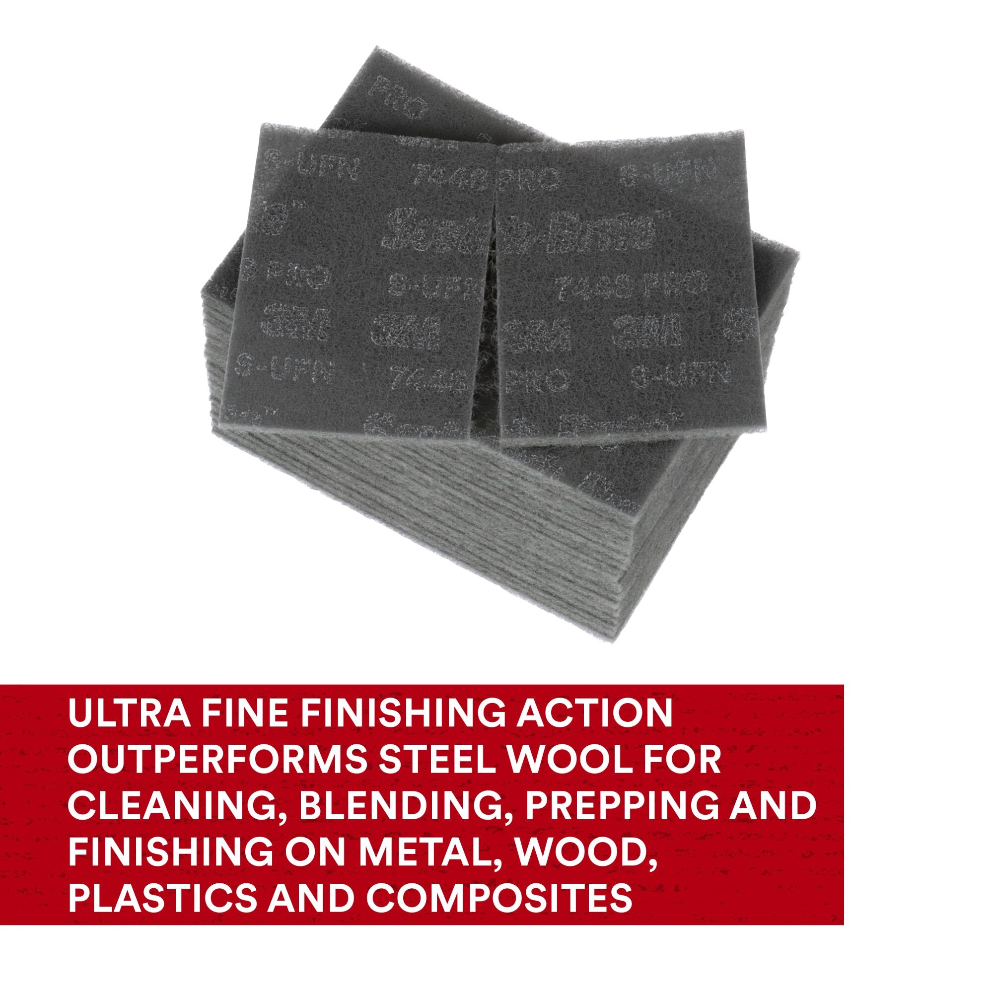 Scotch-Brite 7448 Pro Hand Pads combine durability for long life with flexibility for reaching tight areas. These pads can be used in place of steel wool for conditioning metal surfaces and paint prep in less time than conventional non-woven abrasive products. The tightly graded abrasive particles provide a consistent, uniform scratch throughout life of the pad.Unlike fine steel wool, Scotch-Brite Pro pads will never shred during use, rust after use, or leave fine metal splinters. The durable open-web construction is load resistant, offers long life and consistent abrasive action for cleaning, finishing, and buffing with no need to adjust, turnover, or continue the same project with a new pad. The pad gets into corners and works detailed surfaces without altering the dimensions of the base material. Designed to run cleaner and longer than steel wool, this versatile pad is a useful item for any workshop. You can use the Scotch-Brite 7448 Pro Hand Pad right out of the box by hand, paired with a hand pad block, or run on an in-line sander for faster completion on larger areas.