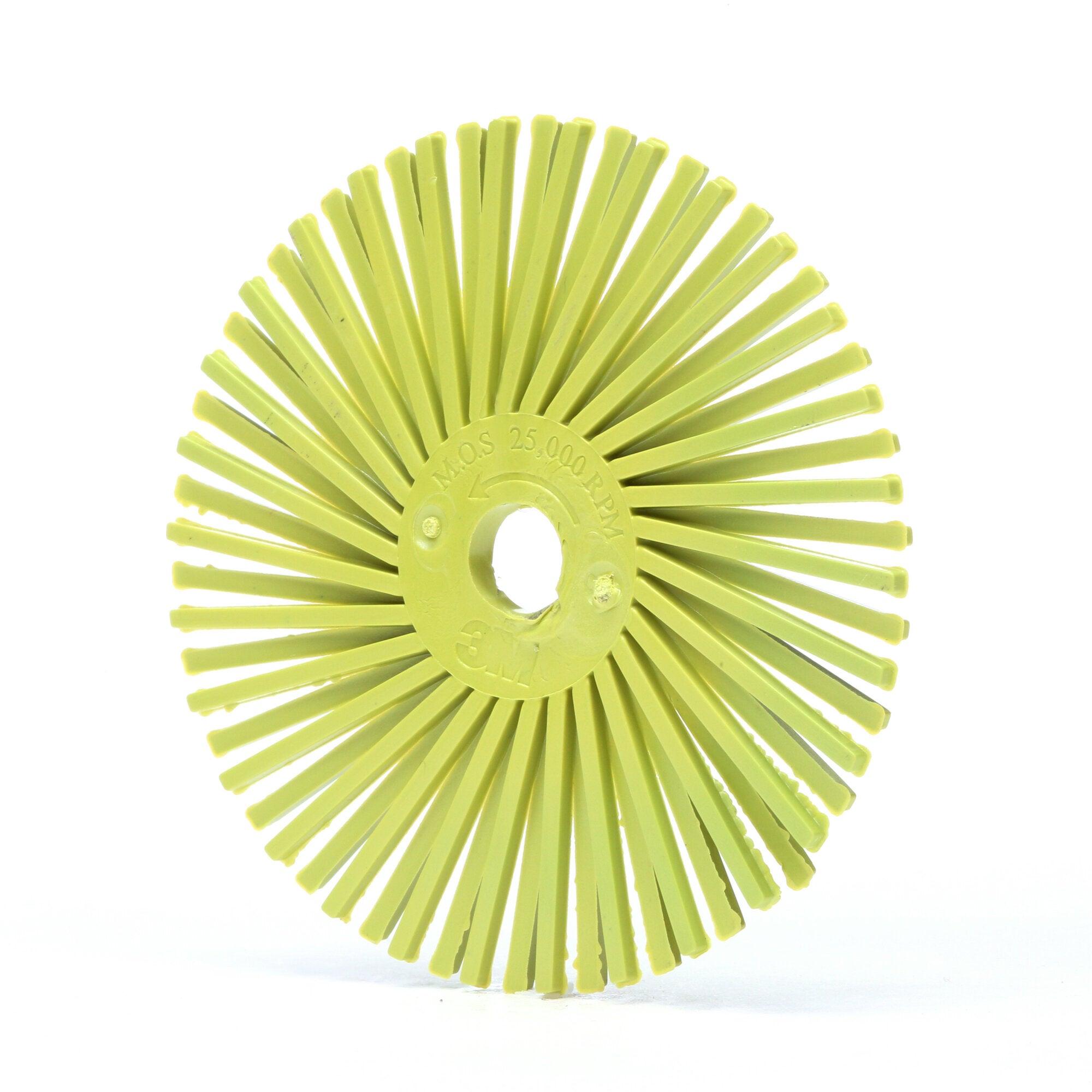 Scotch-Brite Radial Bristle Disc, using proprietary 3M Ceramic Abrasive Grain and molded, flexible bristles, provides more surface contact than wire brushes and maintains abrasive property throughout the life of the disc. This fast-running disc removes paint, stains, adhesives, weld burns, rust, heavy oxides, and surface contaminants from large areas.Under normal use, the flexible bristles on our Scotch-Brite™ Radial Bristle Disc remain safely in place and can achieve the desired finish using light pressure. We designed our disc to last longer than wire and other abrasive discs and works well on aluminum, brass, bronze, carbon steel, cast iron, stainless steel, and other metals; and is used for general industrial, aerospace, automotive, metalworking, transportation, and automotive applications.
