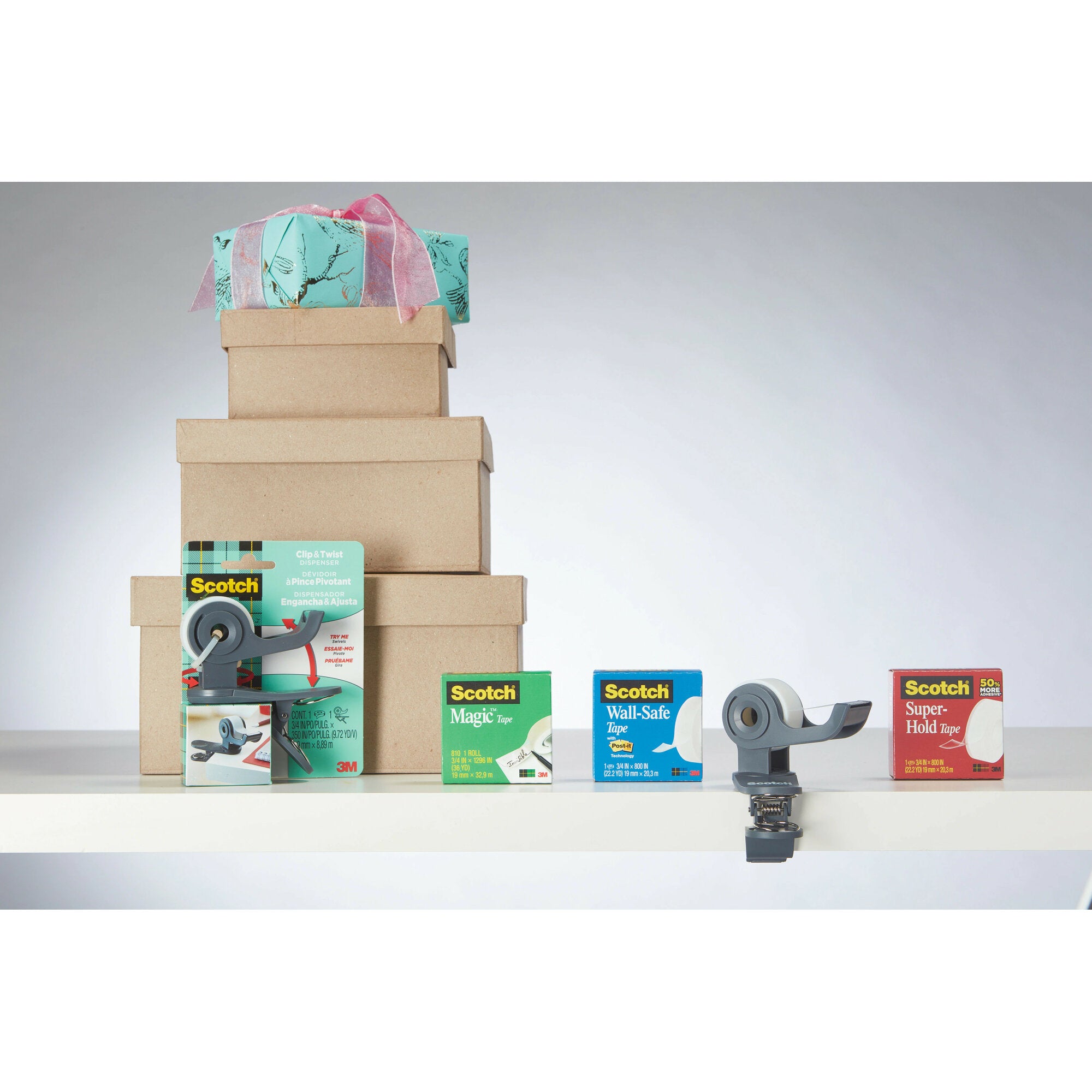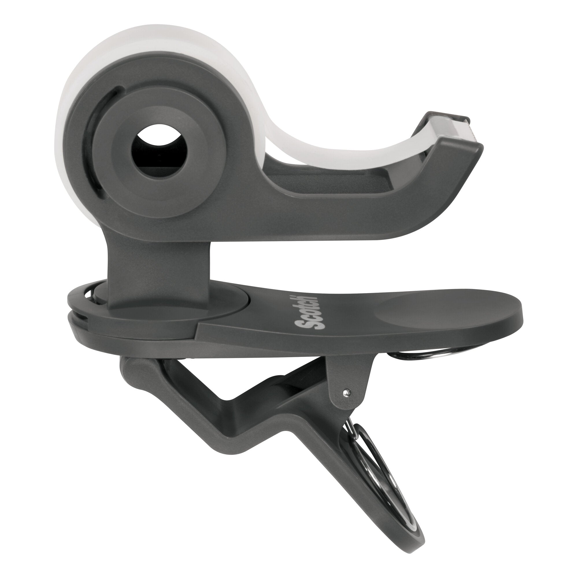 The Scotch Clip & Twist dispenser is unlike any other tape dispenser because it operates in the round and with on-the-go portability. With its dual-rotation engineering, one-handed taping can be done at almost any angle. Clip it wherever you need it, then simply twist it 360-degrees for horizontal surfaces or vertically 180-degrees when clipped to vertical surfaces up to 1-1/4 thick. Be it tables, desks, monitor stands or cubical walls you can feel prepared to wrap, repair, create and more with just a twist of the wrist. Refillable with Scotch Brand -inch tapes, the Scotch Clip & Twist Dispenser is the tape dispensing solution that saves on space, so you can focus on projects at hand. Whether at your desk or on-the-go, just clip. Twist. Tape!The Scotch Clip & Twist dispenser is unlike any other tape dispenser because it operates in the round and with on the go portability. With its dual rotation engineering, one handed taping can be done at almost any angle. Clip it wherever you need it, then simply twist it 360 degrees for horizontal surfaces or vertically 180 degrees when clipped to vertical surfaces up to 1 1/4” thick. Be it tables, desks, monitor stands or cubicle walls– you can feel prepared to wrap, repair, create and more with just a twist of the wrist. Refillable with Scotch Brand ¾ inch tapes, the Scotch Clip & Twist Dispenser is the tape dispensing solution that saves on space, so you can focus on projects at hand. Whether at your desk or on the go, just clip. Twist. Tape!