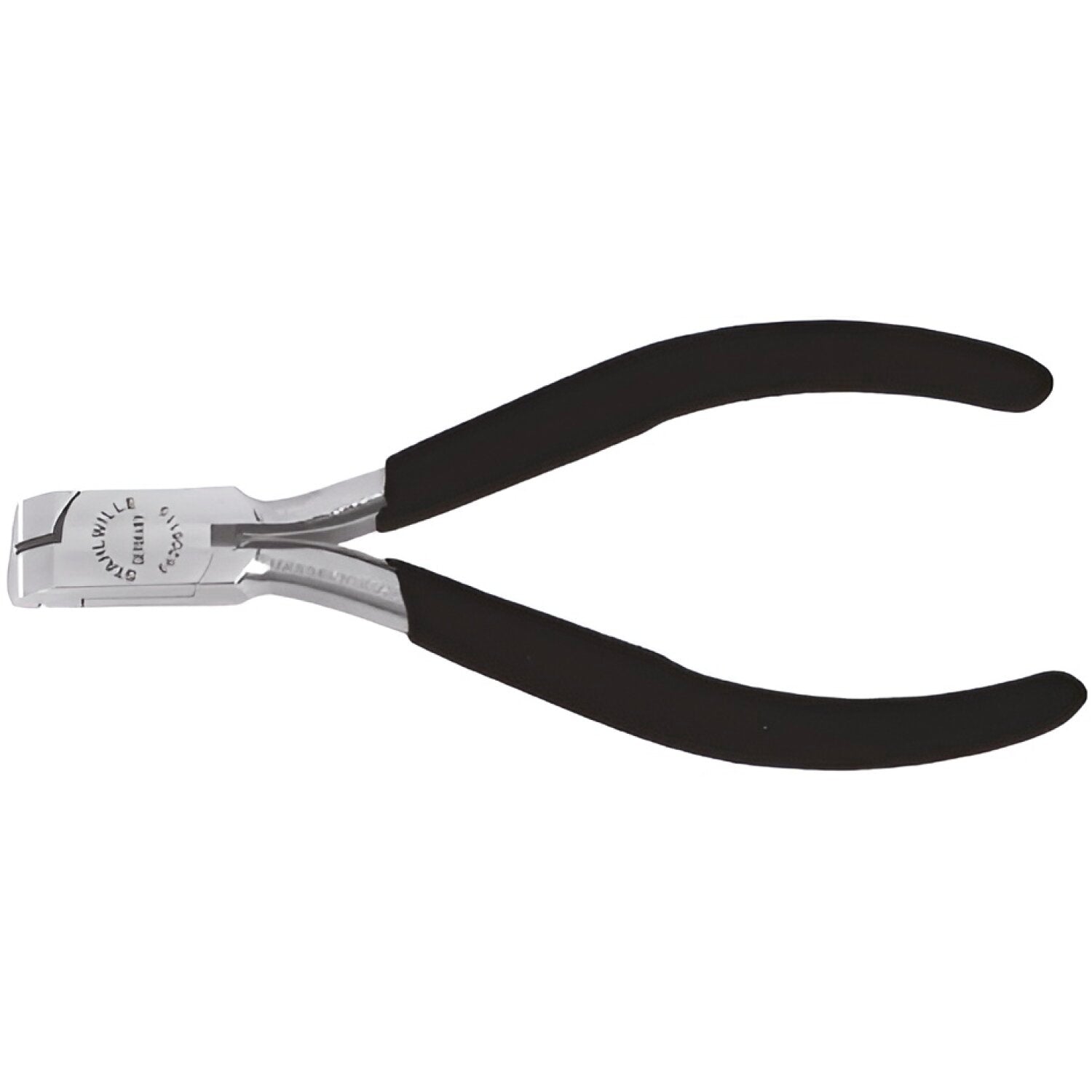 Precision wire cutter manufactured to DIN ISO 9654 standards. Features precision cutting edges suitable for both soft and hard wires, a mini-bevel, a head angled at 90°, and a pointed head for accurate cutting in confined spaces.