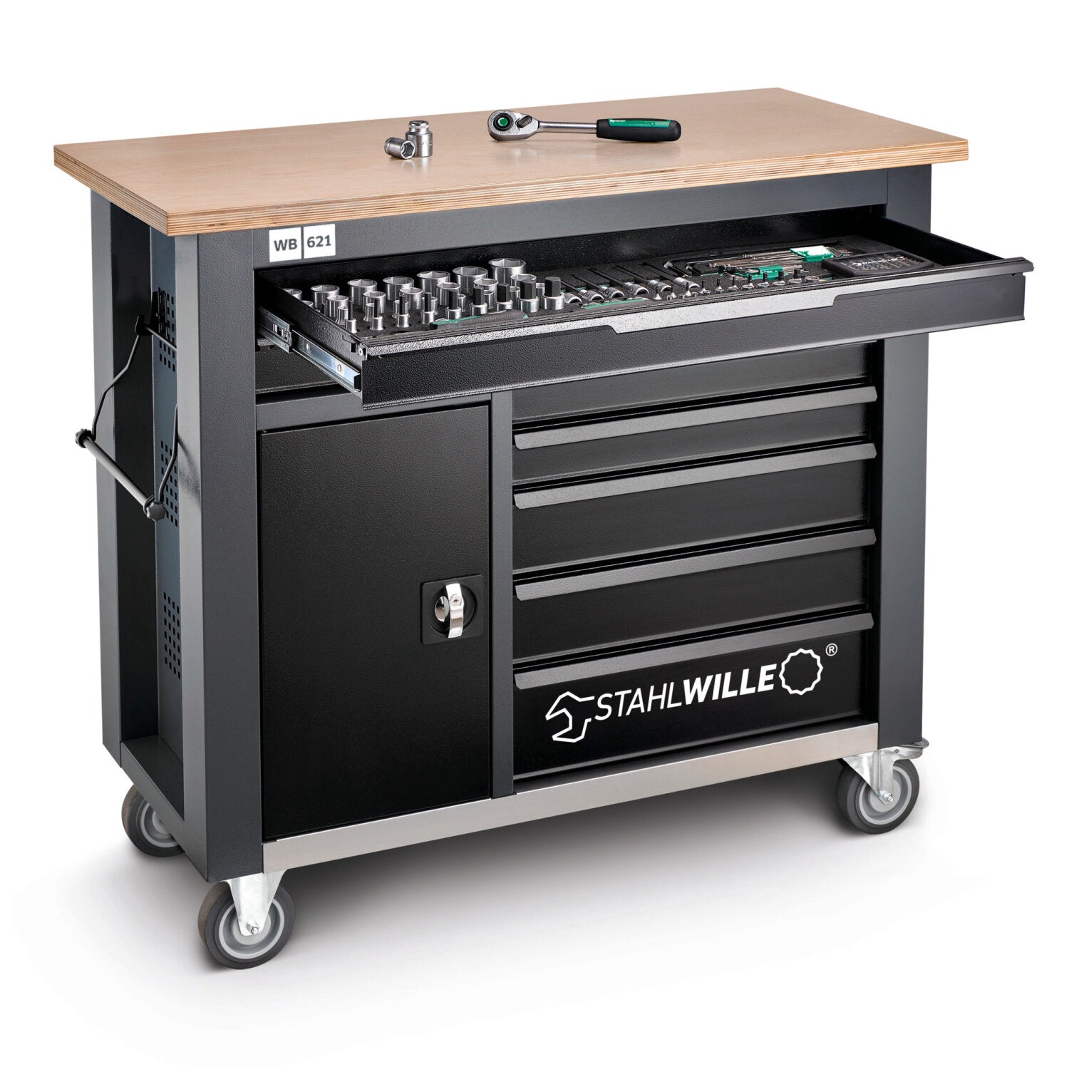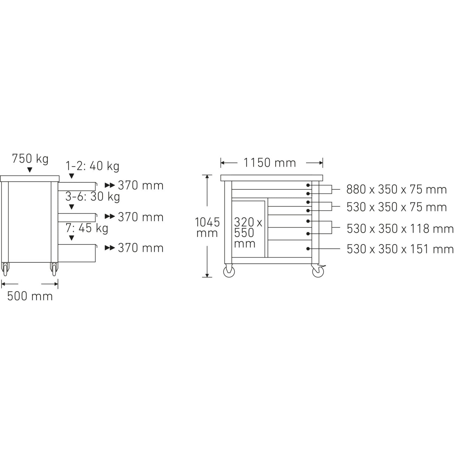 Can be equipped with STAHLWILLE standard and TCS inserts, 1 x 3/3 (XL) + 1 x 2/3 (L) TCS inserts for drawers 1 and 2; 1 x 3/3 (XL) for drawer 3-7