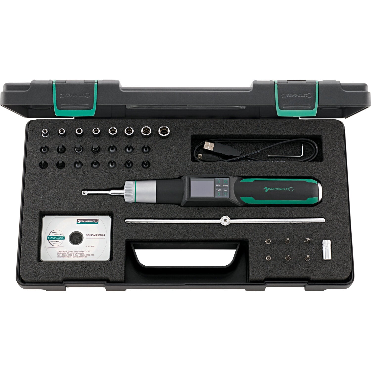 Reliable torque screwdriver with fine-tooth bit ratchet for precise measurements in the low torque range. It features patented electromechanical triggering, combining precise electronic measurement with the familiar mechanical "click." Recorded measurements can be easily documented on the PC via the USB interface. The 29-piece set covers almost all common screw connections in the lower torque range, including socket wrench and screw inserts with hexagon, INHEX, TORX®, and cross-head bits. The robust plastic case reliably protects the tools and accessories from damage and keeps everything neatly in its place.