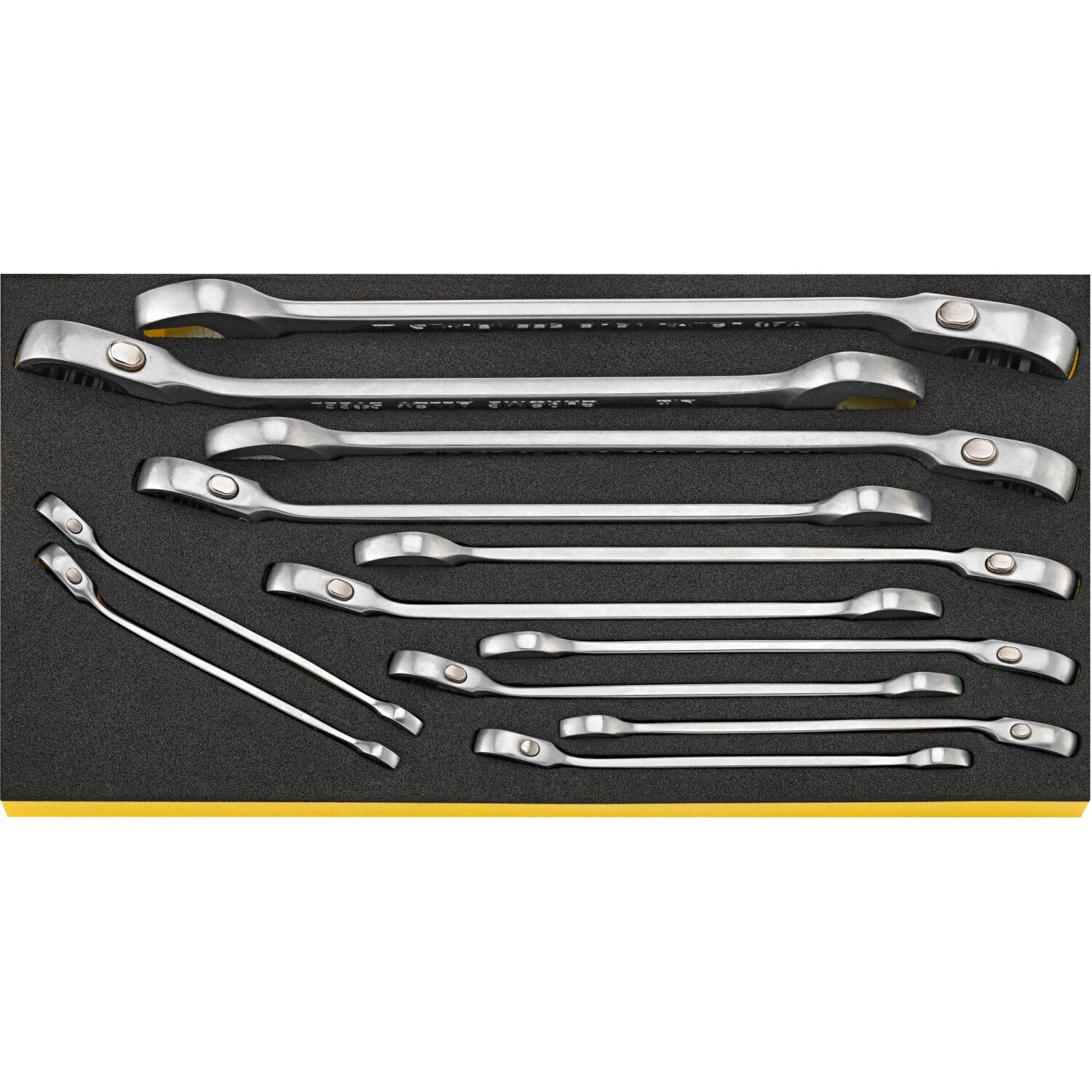 This high-quality combination ratcheting wrench set is available in imperial AF sizes. The integrated ratchet features 72 teeth, allowing ratcheting at an angle of just 5°. The open end is angled at 15° for improved accessibility when tightening or loosening bolts The distinctive STAHLWILLE rounded finish ensures the wrenches are comfortable to hold and easy to grip, providing safe working even with oily hands. The set comes in a TCS inlay, offering a clear and secure storage solution for tool trolleys and workbenches.