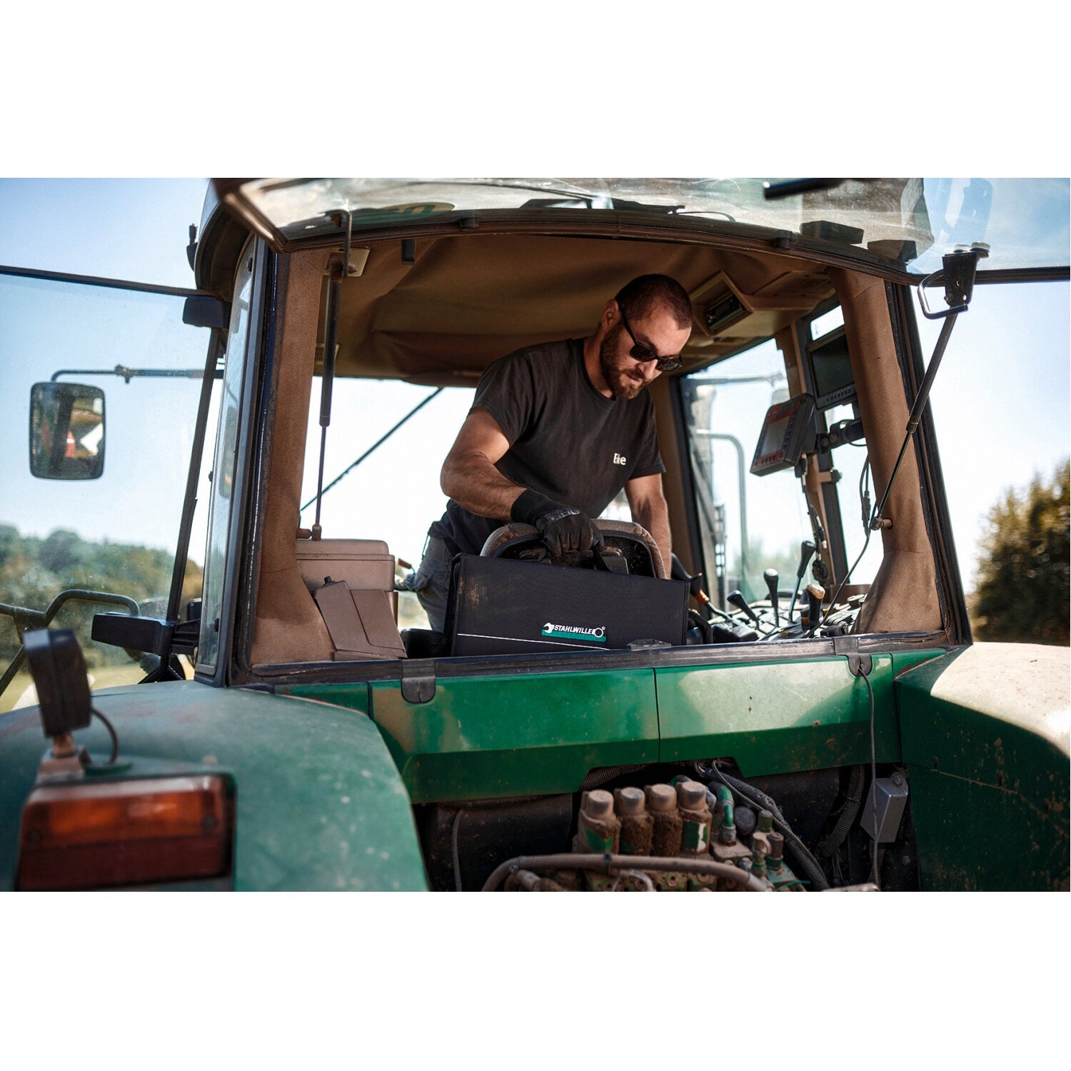 The mobile agricultural tool set can be stored behind or to the side of the driver's seat to save space and is therefore always close at hand.