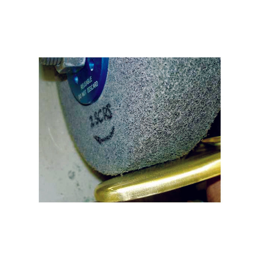 We purposefully engineered our Standard Abrasives™ Multi-Finish Wheel as a low density wheel, so it would conform to the workpiece and leave a soft scratch pattern without greatly altering the geometry of the part. During final finishing with a low density wheel like our Standard Abrasives™ Multi-Finish Wheel, low pressure should be applied. This helps prevent gouging or denting of the surface and, as an added benefit, reduces operator fatigue. Moreover, because the wheel is low density, it splays out a bit more than a hard density wheel would, allowing greater contact with the workpiece surface area.