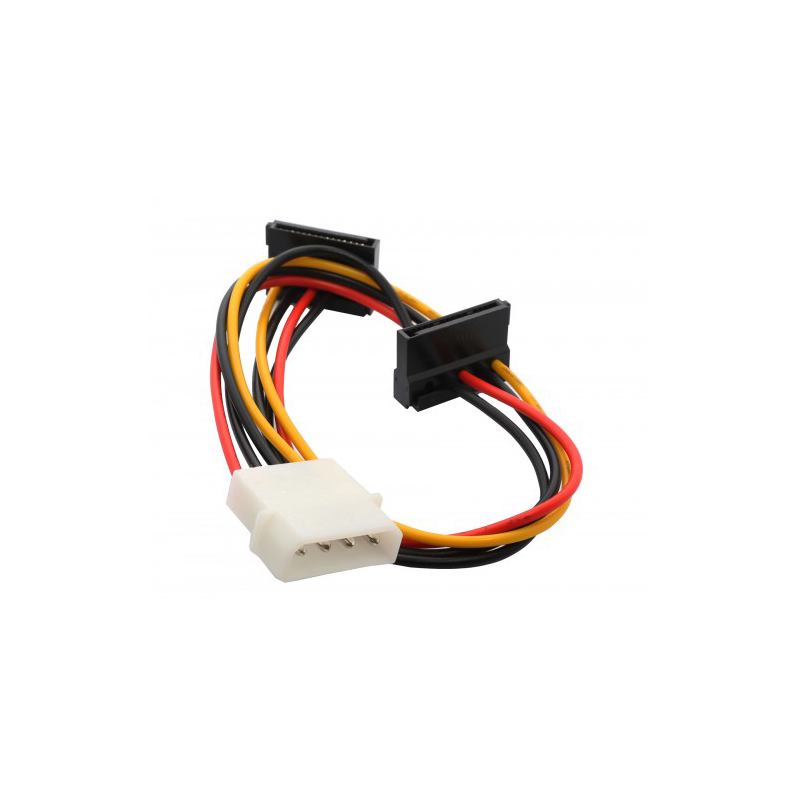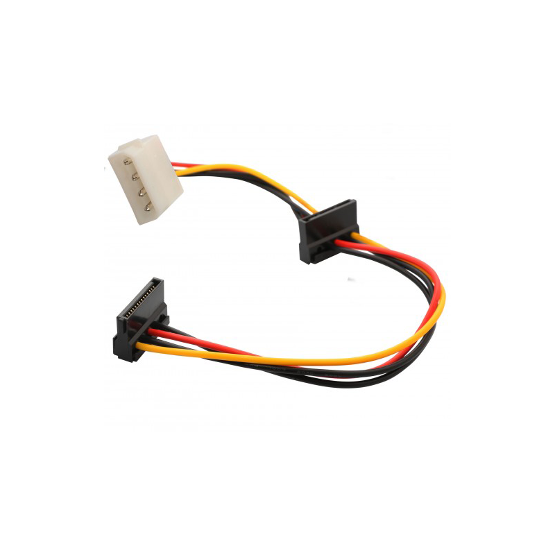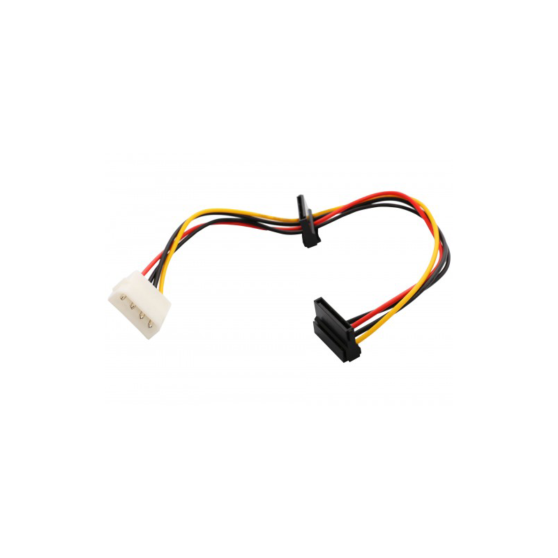 This Syba SY-CAB40018 12 12" Molex to dual right angle SATA power cable features two SATA power (female) connectors and one LP4 molex male connection, a reliable solution that lets you power two SATA devices using a single molex connection to the computer power supply.