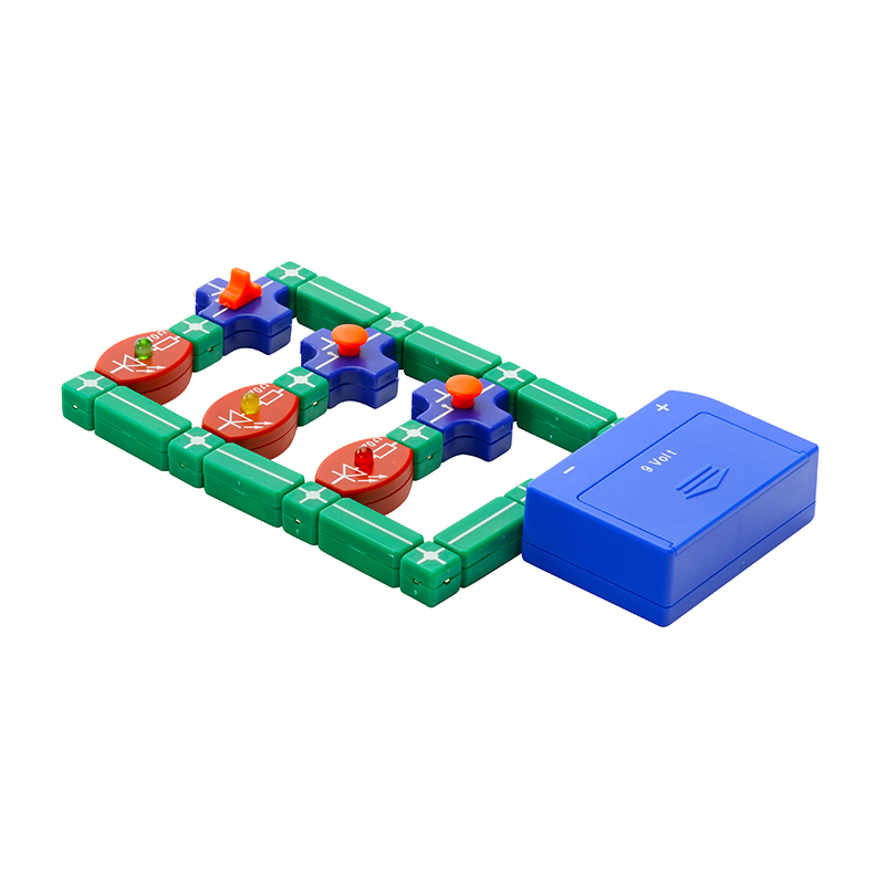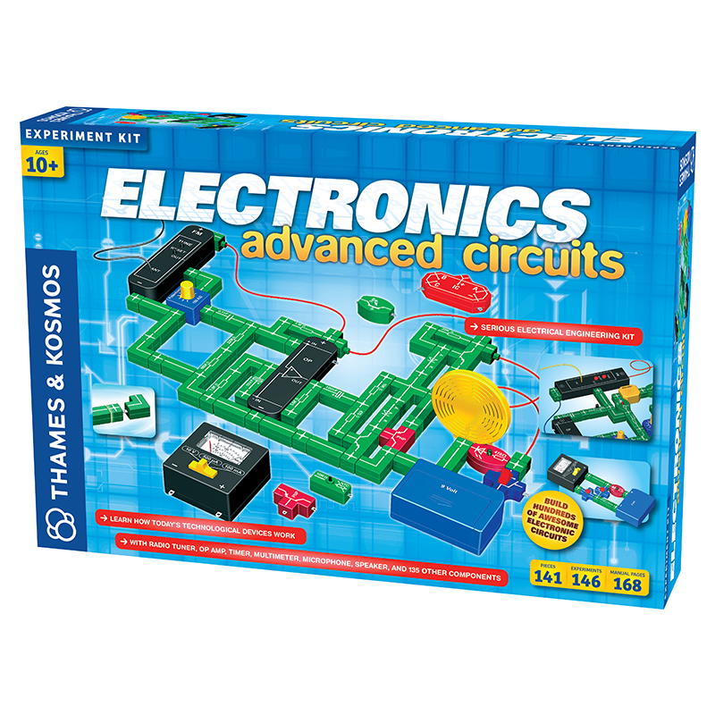 Tap into the awesome world of electronics with this advanced system of snap-together electric building blocks. Start out by experimenting with colorful light-up circuits as you dive into the basics of electricity. Install a sound module to generate the sounds of police cars, ambulances, or fire engines. Learn the important role resistors and potentiometers (variable resistors) play in an electronic circuit. Use a multimeter to measure invisible voltage and current flowing through your circuit. Investigate transistors in switches and amplifiers to learn how the logical circuits in computers work. Build circuits that use sensors to detect moisture, temperature, and visible light. Incorporate capacitors in your circuits to store and discharge electricity for specific functions, such as a countdown clock and a red-green alternate flasher. Test out the indispensable 555 timer to build some complicated circuits. Use an operational amplifier and an FM radio module to build an alarm clock. This kit uses the same unique electric building blocks as our other electronics kits, with the addition of many new advanced components, allowing you to build more complex circuits. The more than 140 electronic components include capacitors, resistors, transistors, LEDs (light emitting diodes), phototransistor, switches, speaker, integrated circuit, infrared LED, diodes, FM tuner, 555 timer, operation amplifier, two potentiometers, electrodes, voltage and current meter, microphone, and 9-volt battery pack.