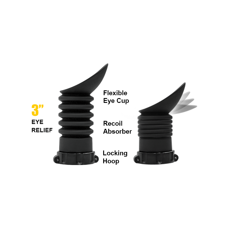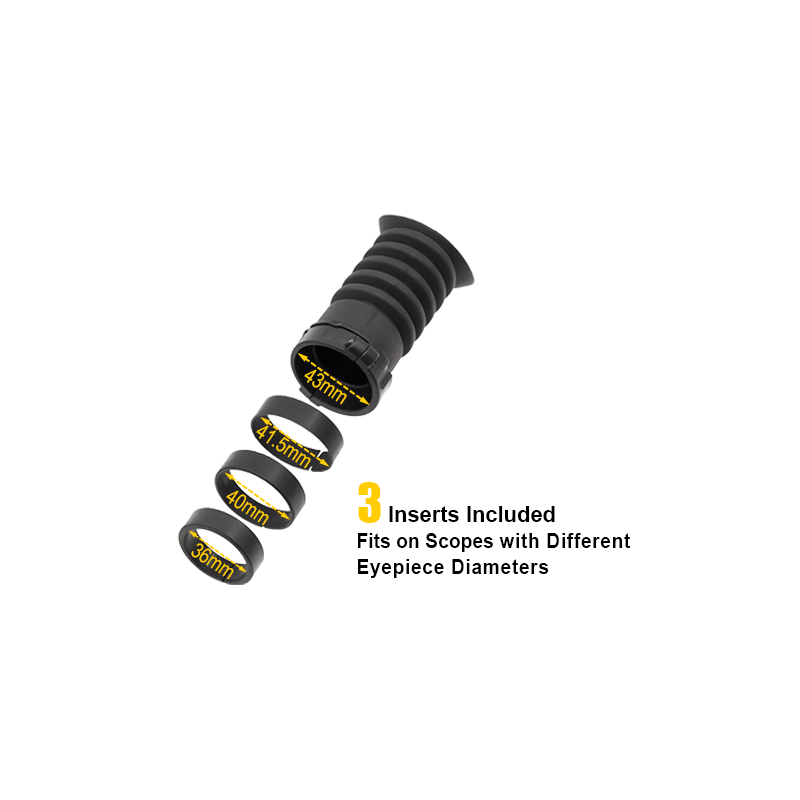 • Made from Rubber Material with Multiple Folds and an Ergonomic Eye Cup, Providing Ample Flexibility as Comfortable Cushion and Protection for the Eye Area Against Recoil • Designed to Fit Scopes with Approximately 3'' Eye Relief • Use with Optics to Relieve Eye Strain by Blocking Glare or Enhancing Low Light, and to Improve Focus on Target by Eliminating Distractions from Peripheral Movement • Eyeshade Design Enables Quick Eye Positioning for Proper Eye Relief and Optic Center Alignment to Speed up Target Acquisition and Increase Sighting Accuracy • Adaptor Kit Includes a Lockable Hoop to Secure on Scope's Eyepiece, and 3 Inserts of Varying Thicknesses to Fit on Scopes with Eyepiece Diameter of 36mm, 40mm, 41.5mm or 43mm