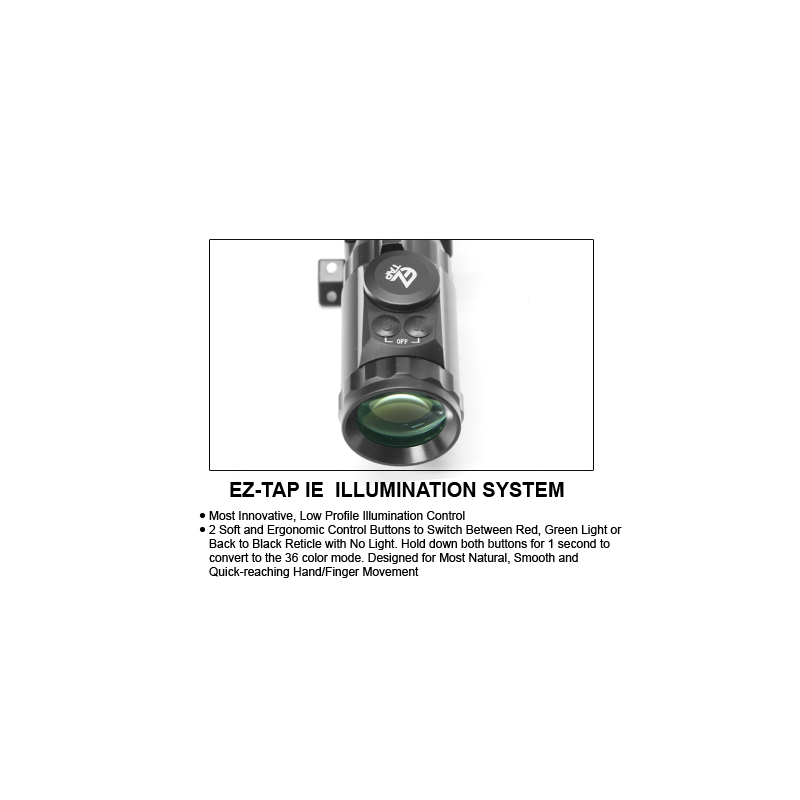 • Best Features Designed for Varmint/Predator Hunting • Built on True Strength Platform, Completely Sealed and Nitrogen Filled, Shockproof, Fogproof and Rainproof • Innovative EZ-TAP® Illumination Enhancing (IE) System with Red/Green Dual-Color Mode and 36 Color Multi-Color Mode to Accommodate All Weather/Light Conditions (U.S. Pat. 8,437,079; EU Patent Pending) • 1-Click High-tech Illumination Memory Feature Gets You Right Back to the Color/Brightness Setting Last Used • Premium Zero Locking and Zero Resetting Target Turrets with Most Consistent and Precise 1/4 MOA per Click Windage/Elevation Adjustment • Emerald Coated Lenses to Achieve Maximum Light Transmission for Best Clarity • Mil-dot Range Estimating Reticle for Most Optimal Aiming and Shooting Performance • Parallax Adjustable from 5 Yds Close Range to Infinity • Complete with RG2W1204 High Quality Max Strength QD Twist Lock Picatinny/Weaver Rings and Flip-open Lens Caps