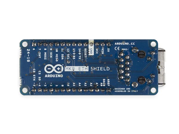 You may want to connect an Arduino® MKR board with an Ethernet cable instead of using WiFi. An Ethernet connection can sometimes be stabler, faster, and more secure. To do this, plug in the Arduino MKR ETH shield.