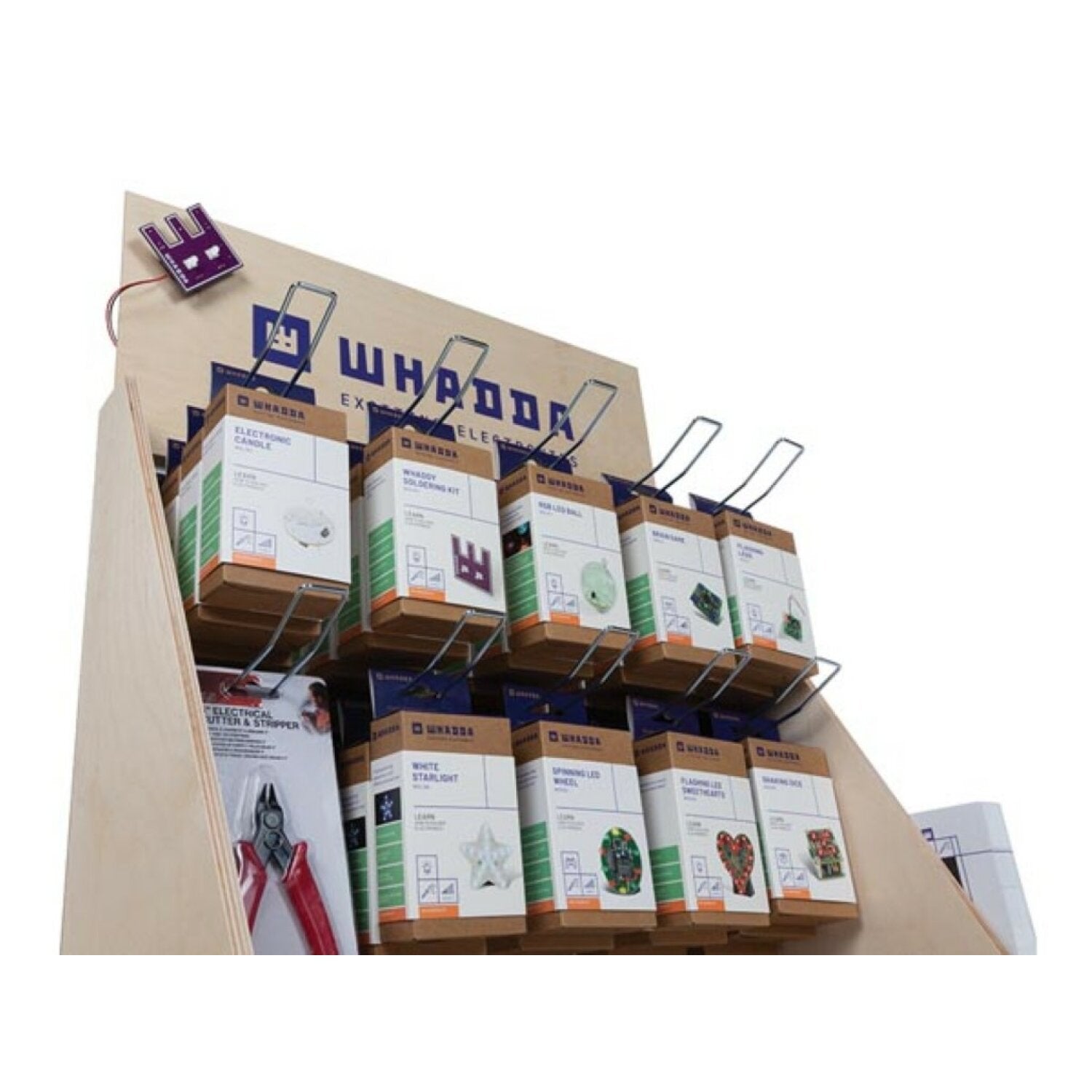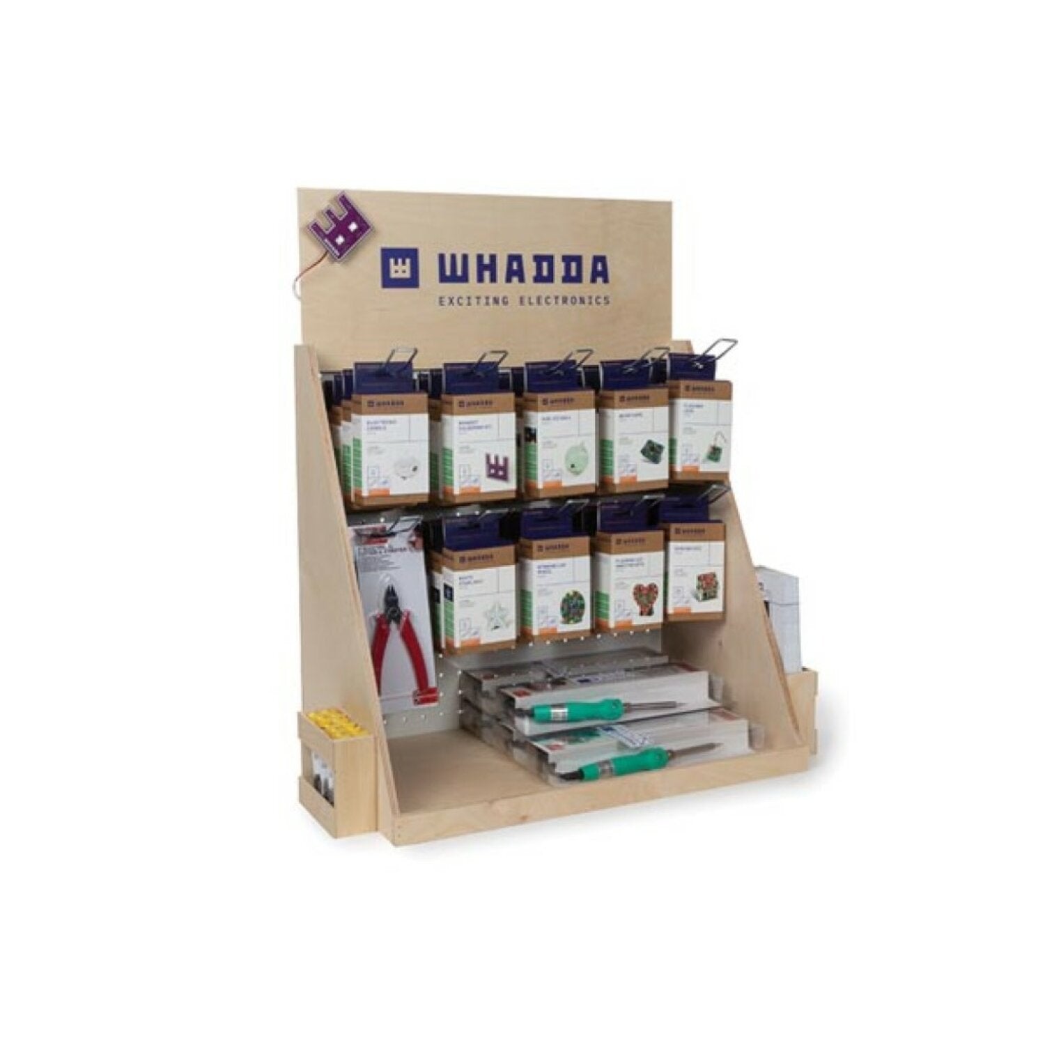 Are you looking for a compact and stylish display to grab your customers' attention? Then you've definitely come to the right place with this wooden counter display. It provides space for many creatives to start soldering at home. This pre-assembled wooden display comes with 9 different soldering kits made at 3 skill levels. Below you'll find quality soldering irons and solder that are ideal for beginners or hobbyists. In short, this eye-catcher has everything you need to start soldering. The display also comes with 'start soldering' brochures and a pre-assembled 'Whaddy' soldering kit that is sure to grab your customers' attention.