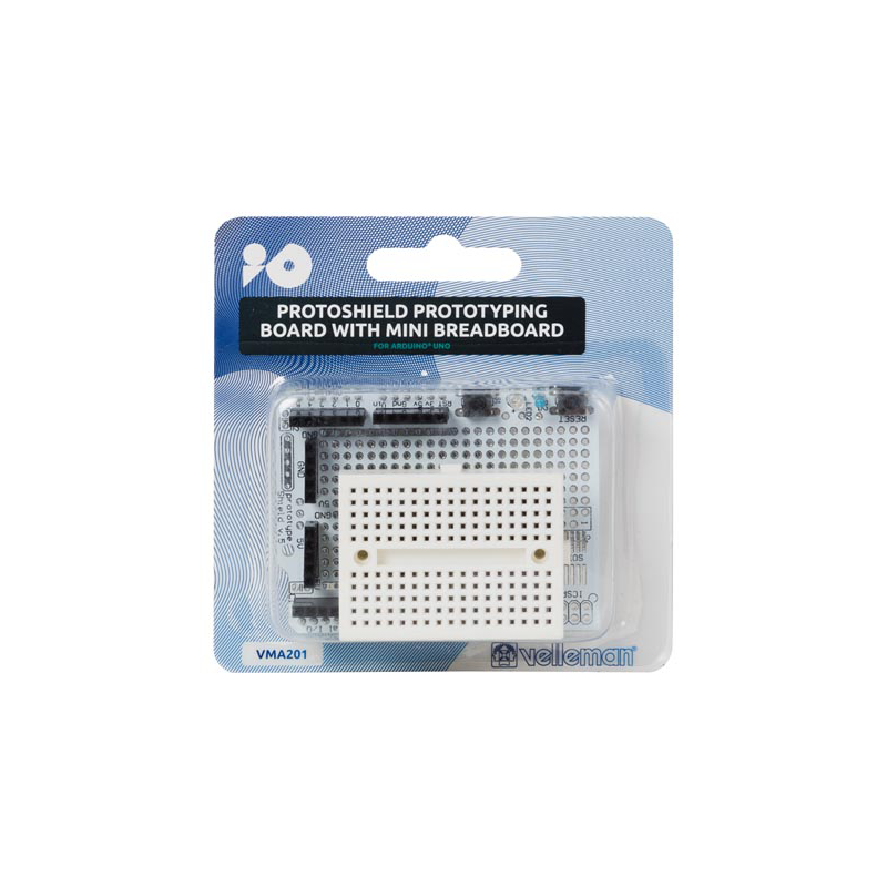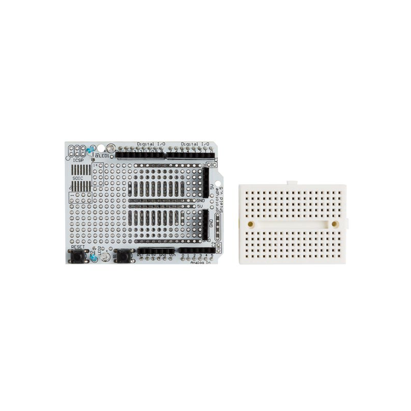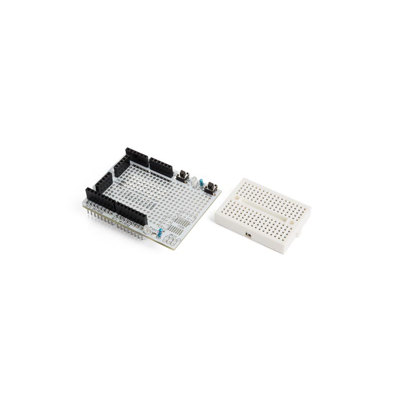 The ProtoShield makes it easy for you to design custom circuits. You can solder parts to the prototyping area to create your project, or use it with the small solderless breadboard to quickly test circuit ideas without having to solder. It has extra connections for all of the Arduino® I/O pins, and provides space to mount through-hole and surface mount.