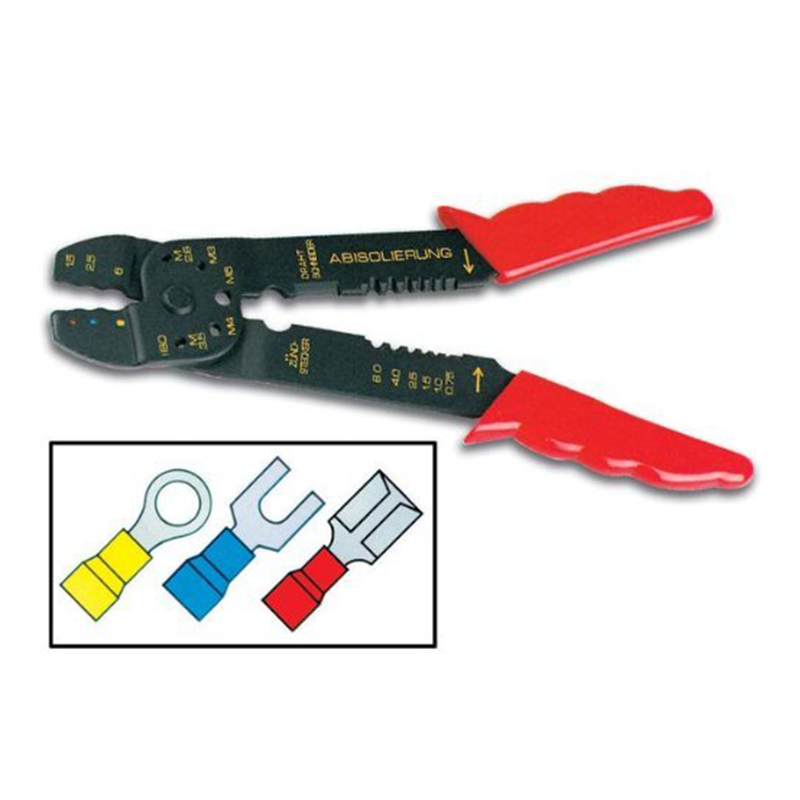 4-way crimping tool : crimper terminal (for insulated terminals), screw cutter (for M2-M5), wire cutter and wire stripper.
