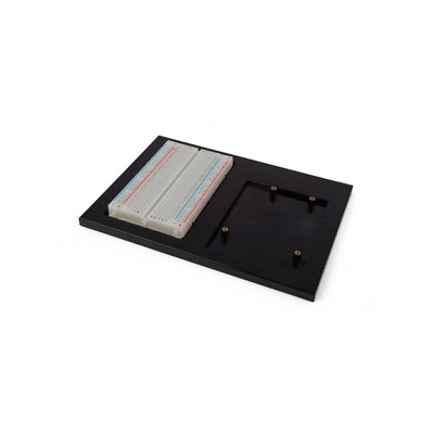 The project holder allows you to attach the Arduino® UNO and the included breadboard together. It contains two grooves (one groove size is 88 x 60 mm), which is the just right size to fit a 400 holes breadboard; the other groove is for the Arduino UNO. The position of 4 M3 screw holes fits the Arduino UNO mounting holes. The holder comes with 4 screws (M3 x 8).