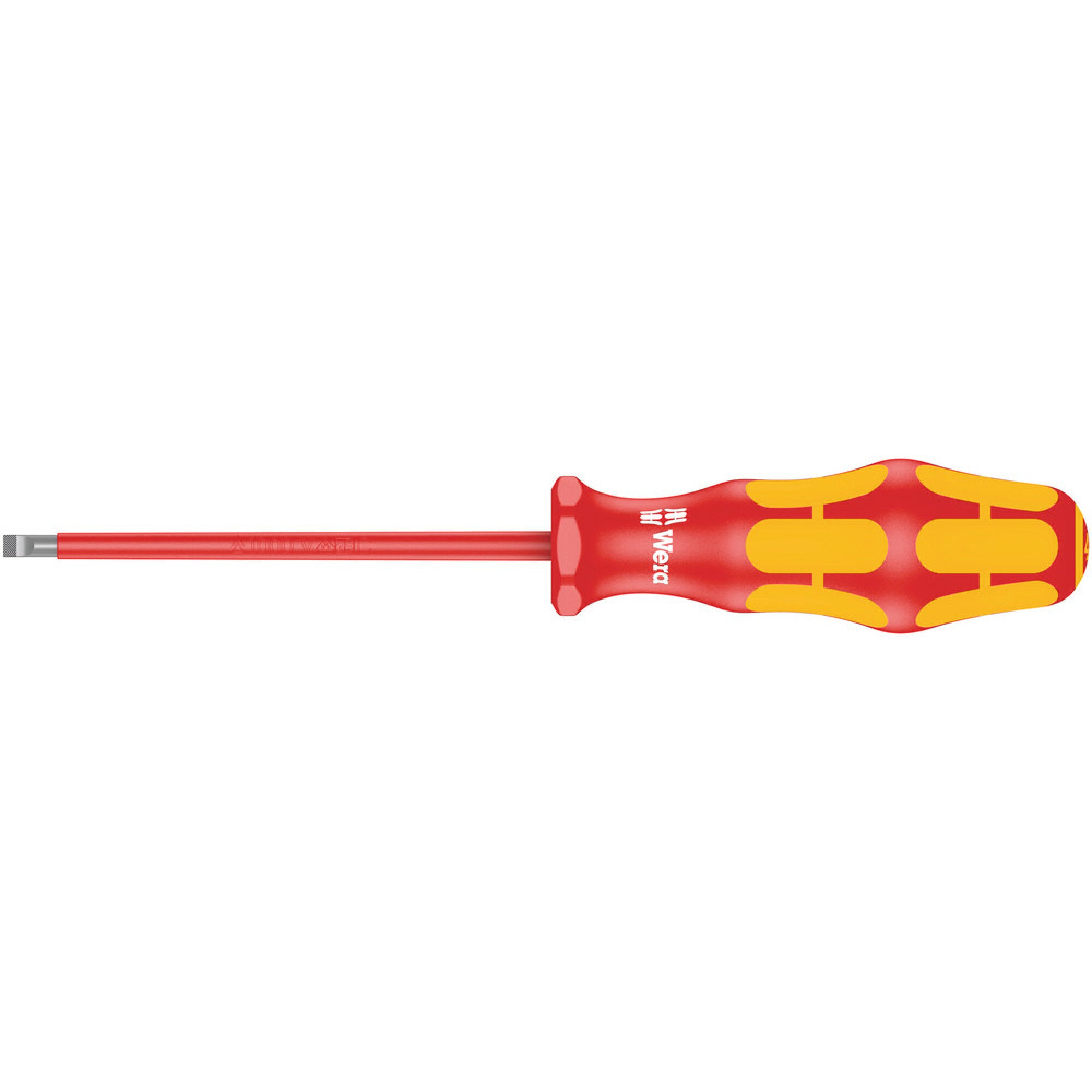 Wera VDE screwdriver with multi-component Kraftform Plus handle for fast and smooth work: Hard handle zones for high working speeds, while soft handle zones guarantee a high torque transfer. Individually tested at 10,000 V for safe working at the approved voltage of 1,000 V. The tips of Wera Lasertip screwdrivers are microscopically roughened with laser beams. This rough surface "bites" into the screw head and unintentional slipping is a thing of the past. "Take it easy" tool finder with colour coding by profile and size stamping - for quick and easy identification of the required tool . The hexagon anti-roll protection avoids bits from rolling away annoyingly at the workplace.