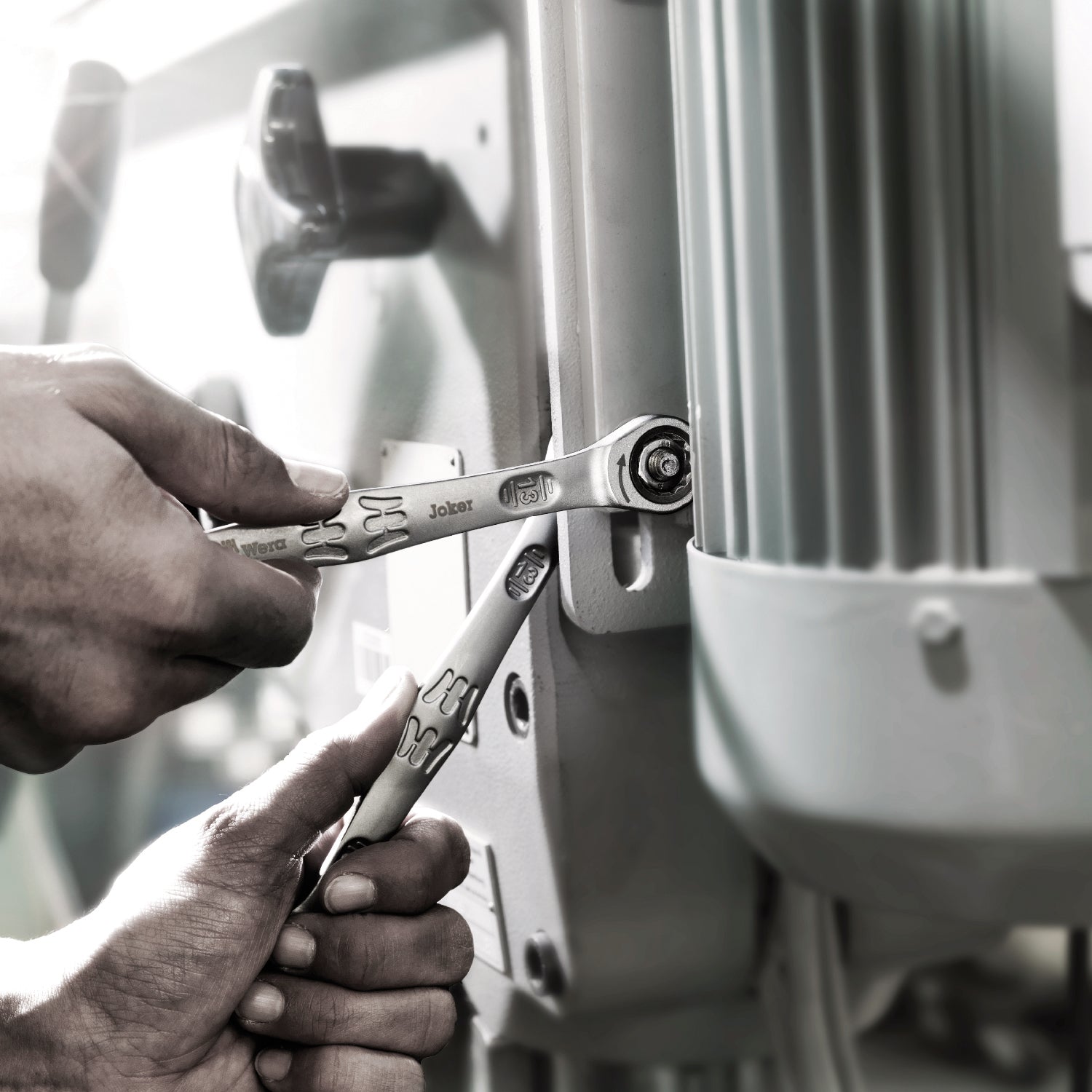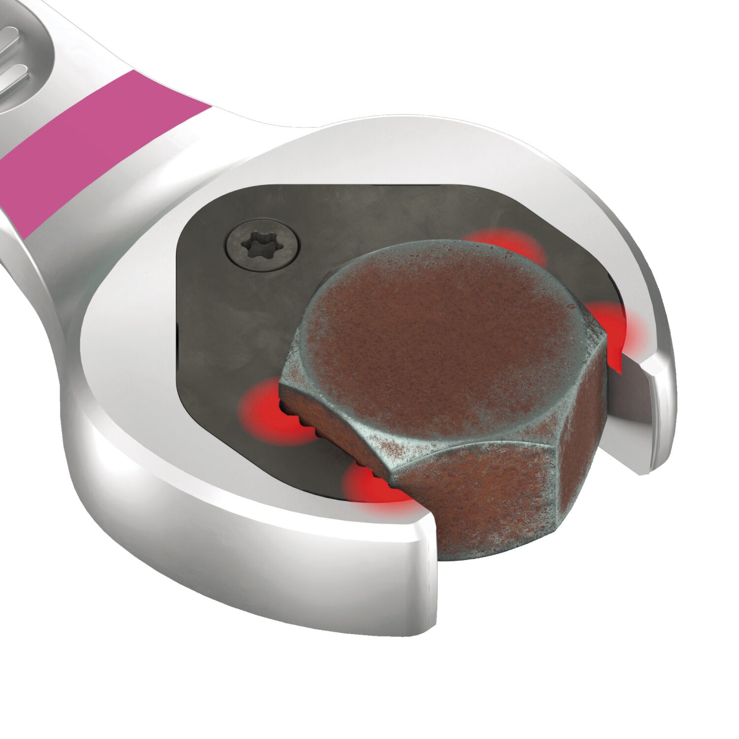 High-quality, metric double spanner from Wera: Everything a wrench can do and so much more. Faster, better, more beautiful. A real Joker! The new generation of double open-ended spanners. For hexagon screw heads and bolts. With holding function by a metal plate in the mouth, which reduces the risk of losing screws and sockets. With its extra hard teeth the exchangeable metal plate in the mouth secures screws and sockets and reduces the risk of slipping. The integrated end stop can prevent the screw head from slipping down and allows application of high torques. The double hexagon geometry ensures a positive connection with the screw or bolt and thus reduces the risk of slipping. A return angle of only 30° avoids time-consuming rotating of the wrench whilst screwdriving. The special forge geometry allows a high torque transmission and high bending stiffness. Made of high-performance chromium molybdenum steel with nickel-chromium coating for high corrosion protection. With tool finder Take it easy: colour coding by size.