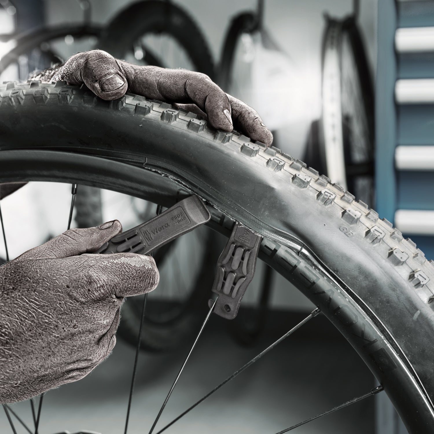 Bicycle repair shops and passionate cyclists love screwdriving on a bicycle. With their Bicycle Set 1, the screwdriving tool specialist Wera offers an assortment of tools that is very mobile thanks to its compact and design-oriented textile folding bag, and offers solutions for the most common screwdriving situations when working with bicycles. The sturdy bag contains the bit ratchet Zyklop Mini 1 and 10 bits with all the benefits of Wera-Bit technology, specially adapted to the most common screw connections on a bicycle. With the glass fibre reinforced plastic tyre levers, the tyres can be safely levered off the rim without damaging the rim.