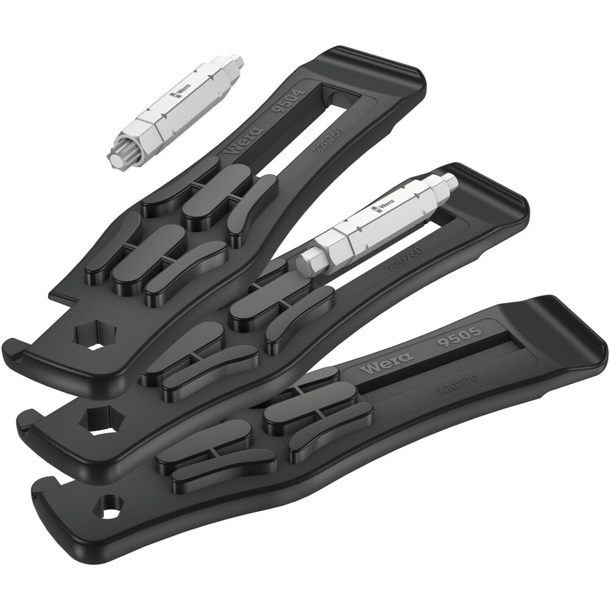 The ultra compact and lightweight bike tools with two quadruple bits and three tyre levers.Four different screw profiles can be operated with just one bit. Significant weight savings of over 50 %. The enormous space savings make the Bicycle Set 15 perfect for mobile use. The operability of the large profiles is made possible by the spring compression of the small tips. The bit with a 1/4" hexagon drive (Wera connection series 1) can also be used with e.g. bit ratchets and bitholding screwdrivers with Rapidaptor. The 9504 tyre lever has a 1/4" mounting for using a 1/4" bit. When both 9504 tyre levers are stacked together, a 4-in-1 bit can be inserted and you get a screwdriving tool. The 9505 tyre lever serves as both valve ejector and bleeder valve. The levers and 4-in-1 bits can be clipped together, so that everything is compact and nothing will be lost.