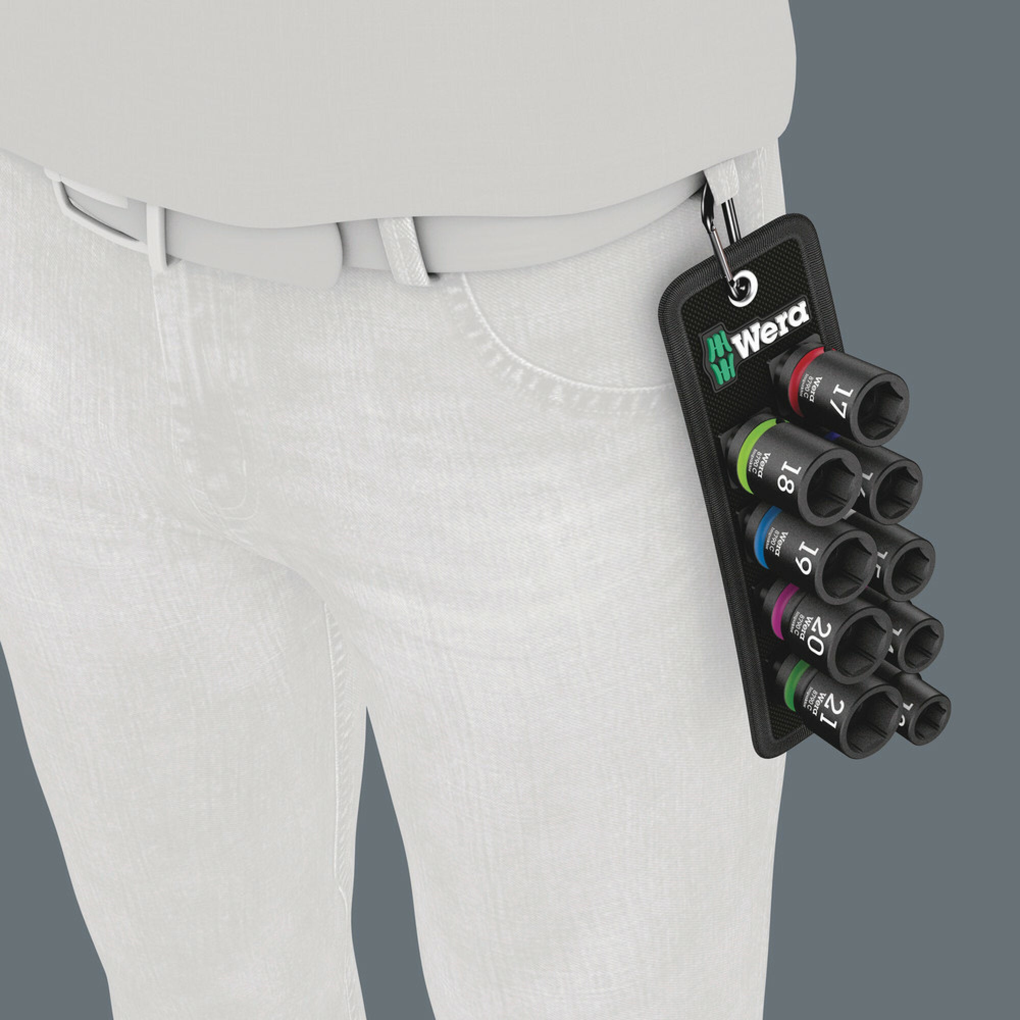Robust textile belt in the typical Wera design with nine Impaktor socket wrench plug-ins for missions in confined spaces. A smooth Twist to Unlock mechanism ensures a secure fit and simple removal of the sockets. Including snap hook for attachment on belt loops or bags. With fleece backing and hook and loop fastener strips for easy attachment e.g. on wall, shelf, workshop trolley and Wera 2go tool transport system. Impaktor sockets for use with electric or pneumatic powered impact wrenches with 12.5mm = ½" drive. Impaktor technology ensures above-average service life, even under extreme conditions. With Take it easy tool finder with colour coding by size - for easy and fast location of the required tool. With hexagonal profile and grooved socket. The hexagon profile allows the transmission of high forces and puts less strain on the edges of bolts or screw heads than a double hexagon profile. For external hexagonal bolts and sockets.