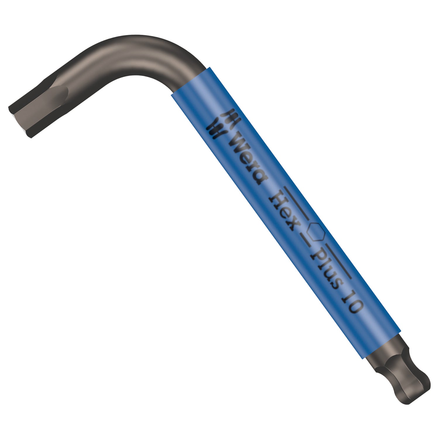 High quality Wera L-keys with colour coded, convenient plastic sleeve. This means that the tool is quickly accessible and the ergonomic and pleasant handle is easy on the hands even at low temperatures. Hex-Plus L-keys provide larger contact surfaces on the screw head. The notching effect is thereby reduced to a minimum; the destruction of the screw head is almost eliminated. The ball on the long arm allows safe working even in difficult mounting positions. The BlackLaser surface treatment provides excellent surface protection, corrosion resistance and long life. Laser coated abrasion-resistant size markings on the L-keys for quick access.