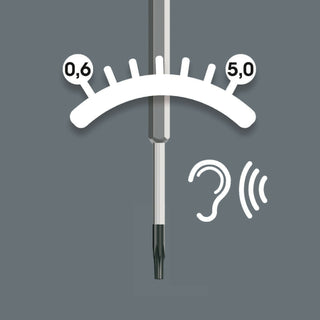 Wera torque screwdriver with fixed torque for hexagon socket screws. Tamperproof and with a slim hex blade. Unlimited torque for loosening seized screws. Multi-component Kraftform handle for pleasant, ergonomic working that prevents blisters and calluses. Hard gripping zones for high working speeds whereas soft zones ensure high torque transfer.