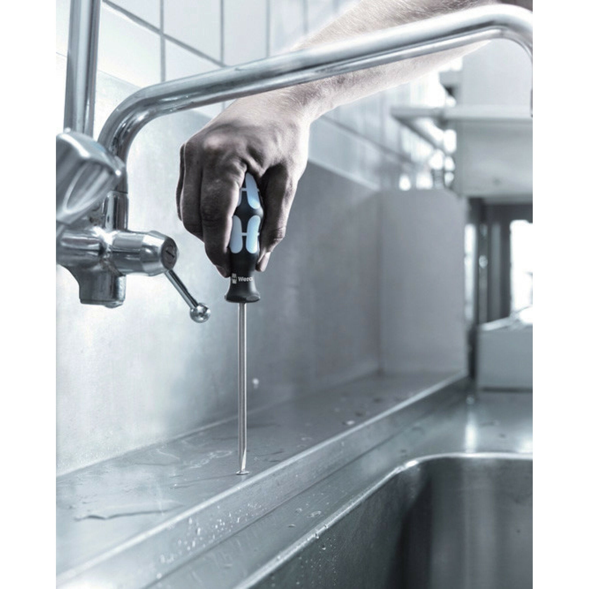 High quality Kraftform Plus screwdriver out of stainless steel. The stainless tools from Wera are vacuum ice-hardened and have the hardness and strength needed for screw connections. They can be used for industrial application without hesitation. Multi-component Kraftform handle for fast and low-fatigue working. "Take it easy" Tool Finder: colour coding according to profile and size. The hexagonal anti-roll feature prevents any bothersome rolling away at the workplace.
