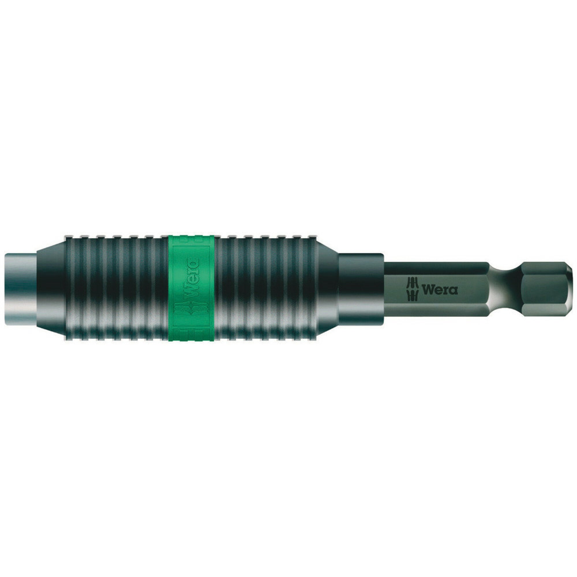 Universal holder for bits with ¼" hexagon head drive as per DIN ISO 1173-C 6.3 and E 6.3 (ISO 1173). BiTorsion holders by Wera have a torsion spring that absorbs low peak loads during screwdriving jobs. The combined use with BiTorsion bits and their torsion zones extends the service life of the tool considerably. BiTorsion holders by Wera can, however, also be used with conventional bits. The Rapidaptor technology allows bits to be attached without any need to actuate the sleeve. The removal of the bit is simple, just by pushing the sleeve forward. This enables rapid bit change with just one hand. ¼" hexagonal, suitable for power screwdrivers with take-up as per DIN ISO 1173-F 6.3.