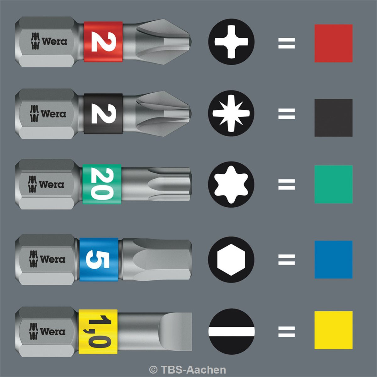 Impaktor bits are color coordinated to match Wera’s “Take it Easy Tool Finder” color schemes, multiple styles available