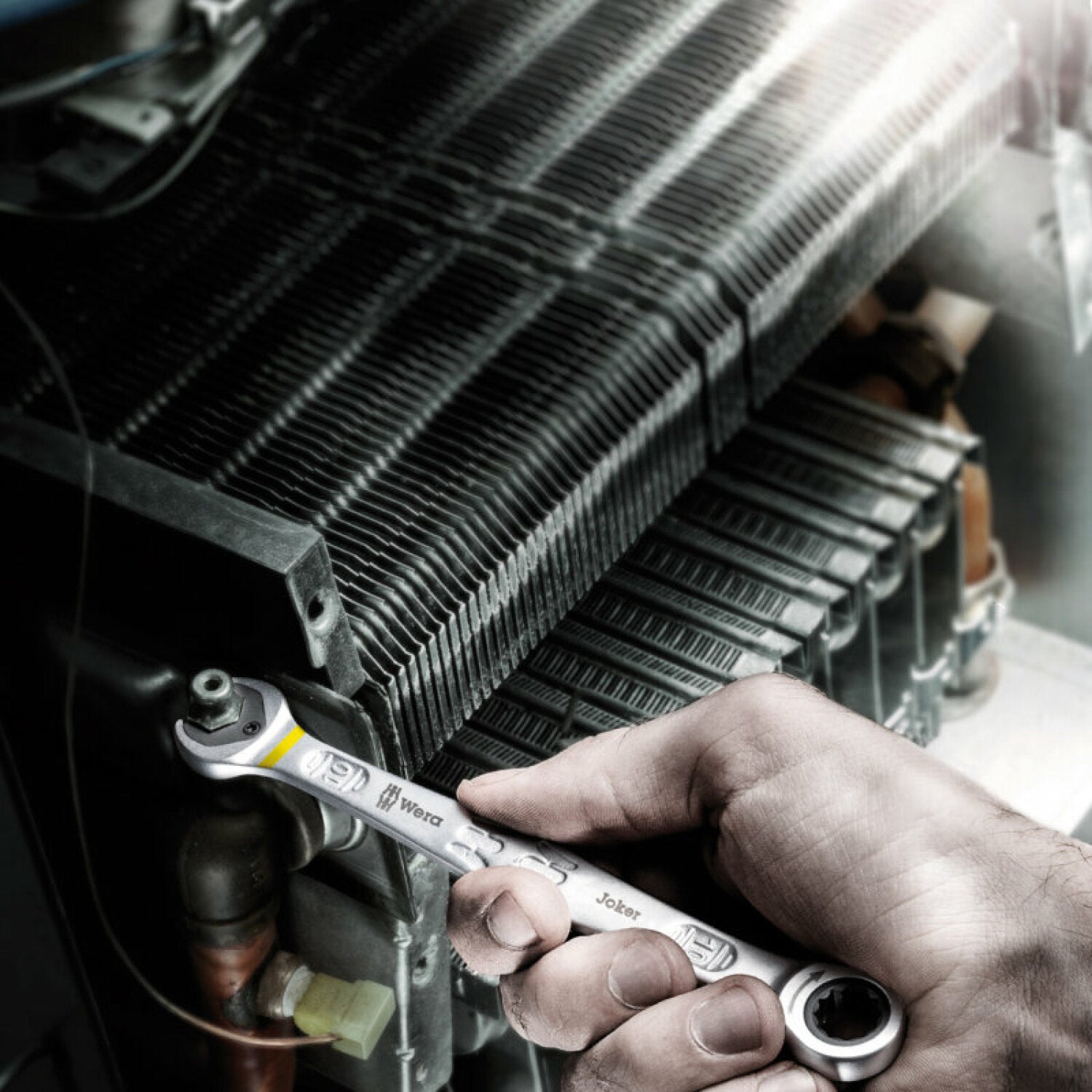 High quality, imperial, combination ratchet wrench by Wera. Everything that a wrench has to be able to do. And a whole lot more. Faster, better, stylish. Yes, a real Joker. The new generation of combination ratchet wrenches. Suitable for hexagon socket screws, bolts or nuts. Comes with holding function, thanks to the metal plate in the jaw, which reduces the risk of dropping nuts and bolts. The replaceable metal plate in the jaw secures nuts and bolts with its extra hard teeth and reduces the danger of slipping. The integrated limit stop prevents any slipping around the bolt head and allows higher torque to be applied. The double-hex geometry makes for a positive connection with nuts or bolts and reduces the risk of slipping. A return angle of only 30° at the open end prevents any time consuming flipping of the wrench. The ratchet mechanism at the ring end, with an exceptional, fine-tooth mechanism - 80 teeth in all - enables flexibility even in very confined working spaces. The specially forged geometry ensures high torque transfer and strength. The ratchet is manufactured out of high performance chrome molybdenum steel with nickel-chrome coating for high corrosion protection. "Take it easy" Tool Finder with colour coding according to sizes.