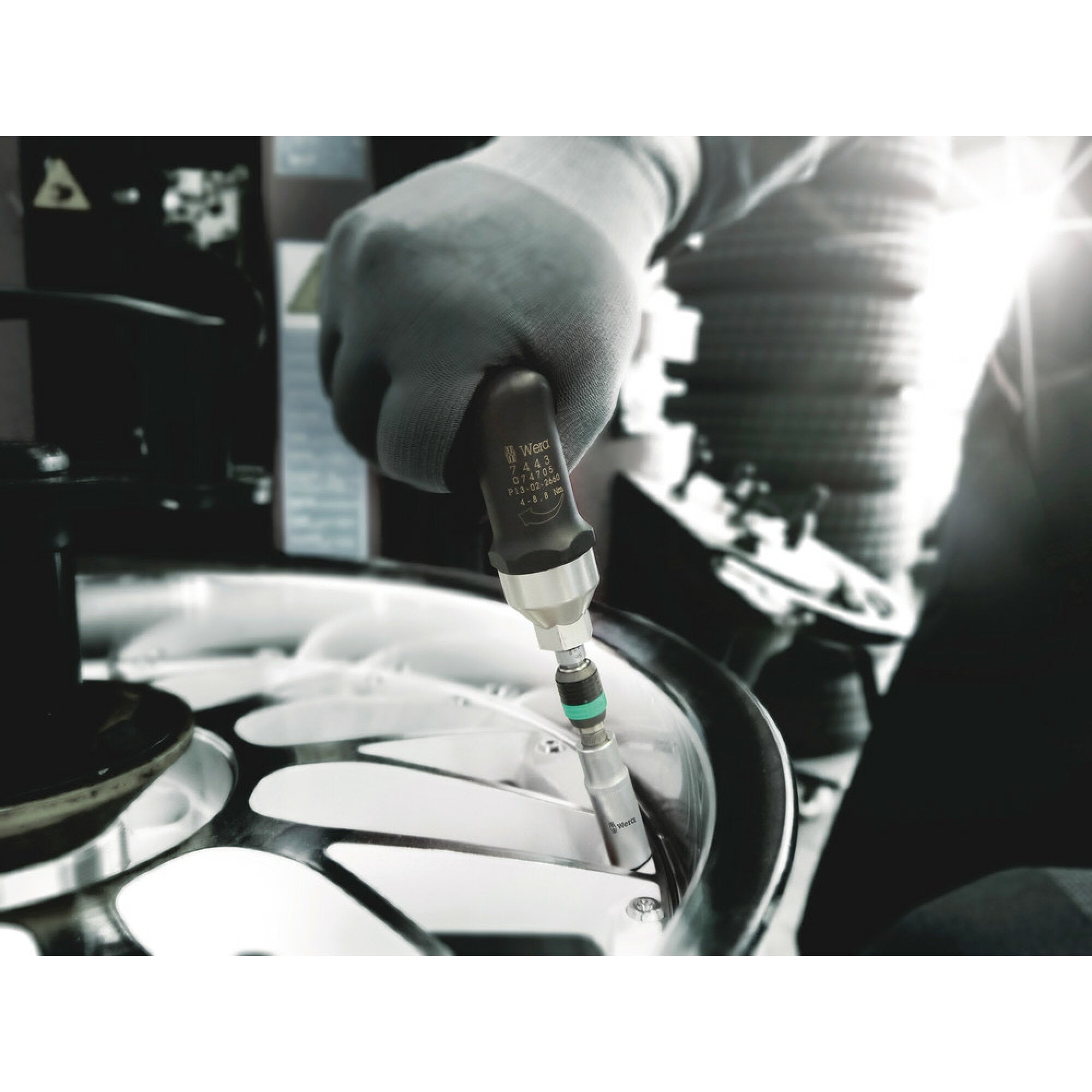12-piece tool set for the proper assembly and disassembly of tyre pressure control systems. Comes with torque technology for controlled screw tightening. Hand tool with multi-component Kraftform handle for high working speeds and ergonomic working. Five pre-set tools to connect the union nut with the screw and to fasten the sensor component to the valve. Two pre-set valve insertion tools with 0.25 and 0.45 Nm. An adjustable Kraftform pistol handle for torque values of between 4.0 and 8.8 Nm. Suitable for all customary tyre pressure control systems. Dependable fastening thanks to distinctly coloured marking of the pre-set torque values (Beru/Huf®: TX 10 yellow 1.25 Nm; Schrader®: TX 10 green 1.4 Nm; Cup®/RTS®: TX 20 grey 2.0 Nm). Two TX bits with holding function, socket adaptor, two sockets plus a valve dolly (for applications up to 4.5 Nm). Suitable for tyre control, systems from e.g. Schrader®, Alligator®, VDO®. The pre-set torque screwdriver fixed at 3.3 Nm actuates both the union nut as well as the connecting screw on the sensors of the Alligator system. Additionally included: socket adaptor, two bits, valve dolly (for applications up to 4.5 Nm).