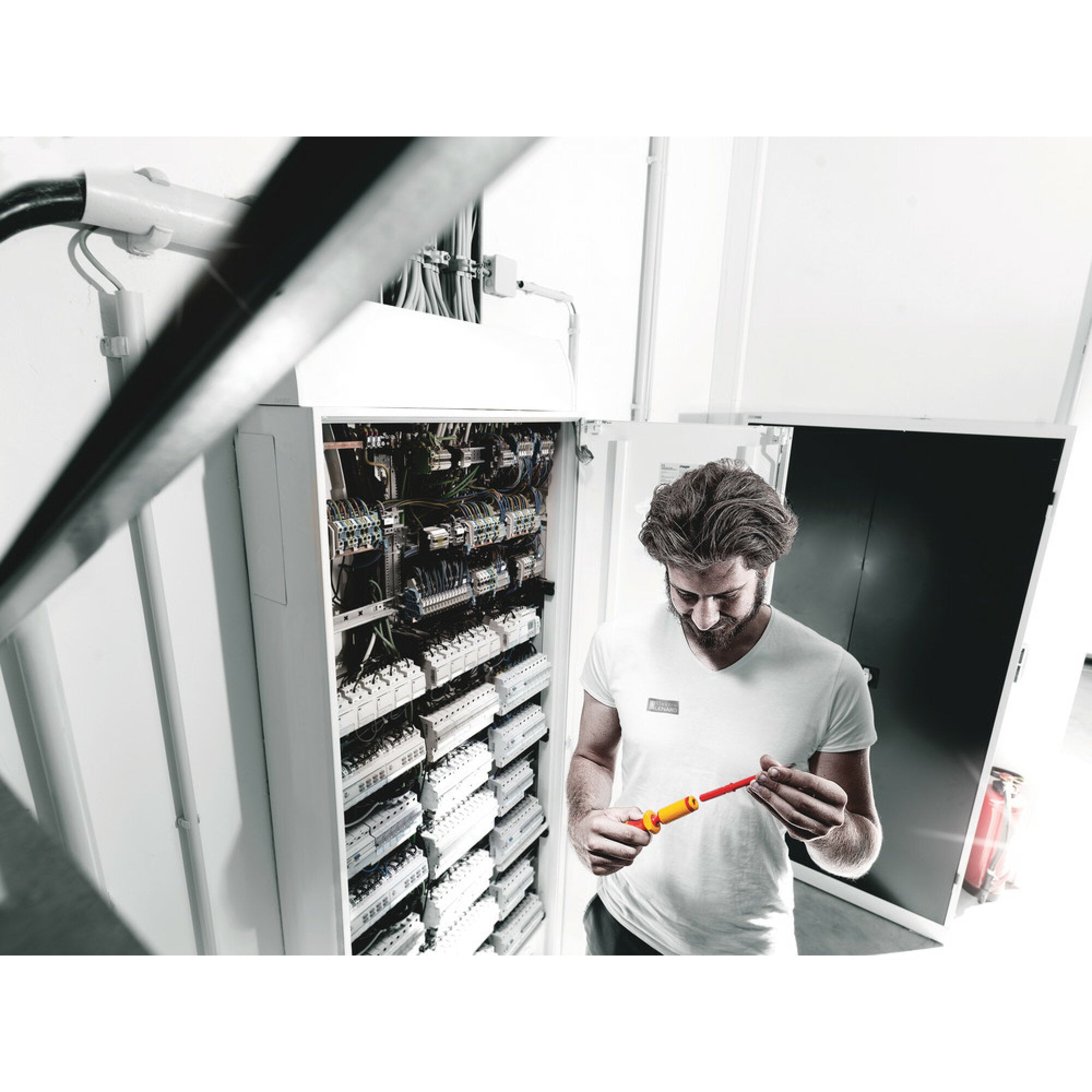 Torque VDE holder for safe work up to 1,000 volts. Adjustable torque value from 1.2-3.0 Nm. Distinct audible and perceivable excess load signal when the pre-set torque value is reached. Unlimited manual loosening torque. For Kraftform Kompakt VDE blades: the handle/interchangeable blade system allows a rapid exchange of the blade and thereby diverse applications.