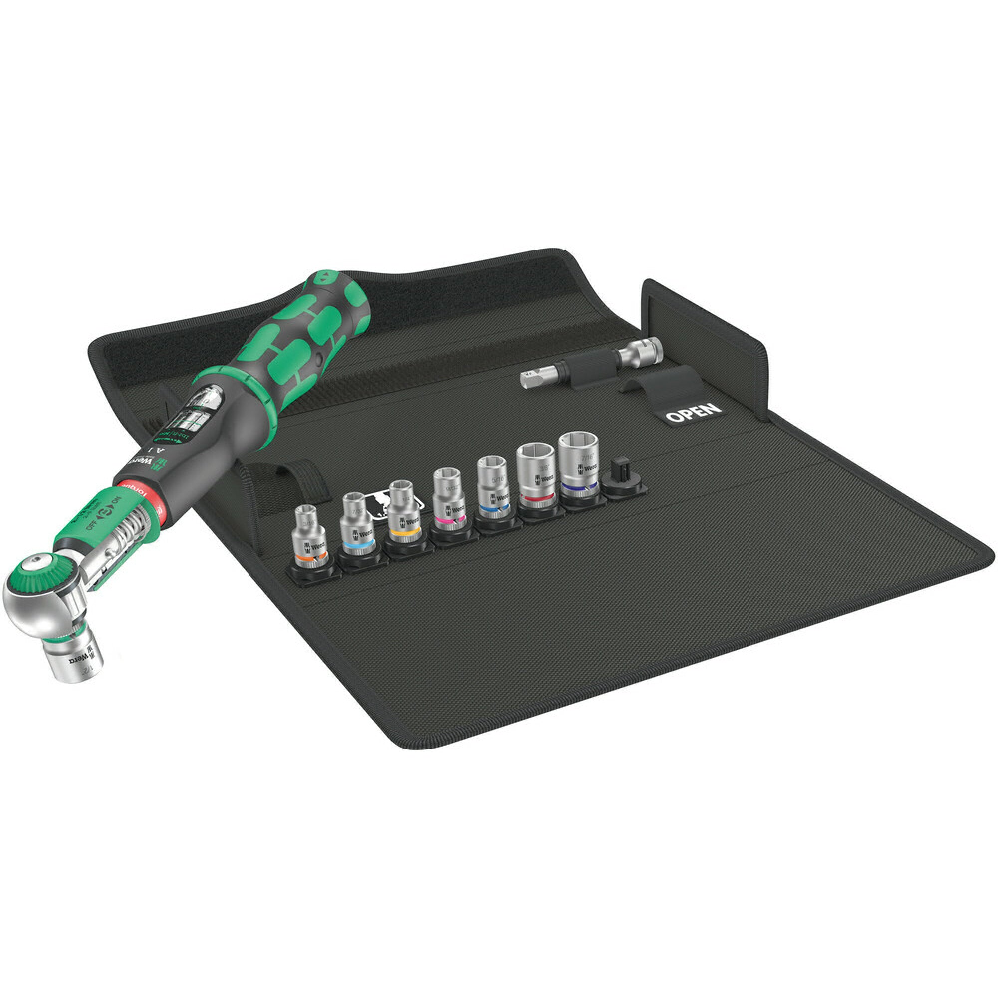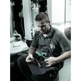 10-piece 1/4" torque wrench set in a robust textile box; torque wrench with slide-over mechanism. Once the set torque has been reached, the tool cannot be overtightened, so that excessive torque cannot be applied. Setting range of 2 to 12 Nm for controlled clockwise and counterclockwise torque operation. Easy setting and saving of the default value: The audible and tactile clicks on reaching the scale values facilitate the safe setting of the desired torque value. The Torque Lock function allows use as a standard ratchet without torque function. Thus also usable for applications with angles of rotation. Max. breaking torque of the ¼" square head as per DIN 3122. The return angle of only 5° allows the ratchet to be used even in confined spaces. Included are: Safe-Torque A 1 torque wrench, 1/4" square head, 2-12 Nm, 8 sockets with 1/4" drive and one short extension.