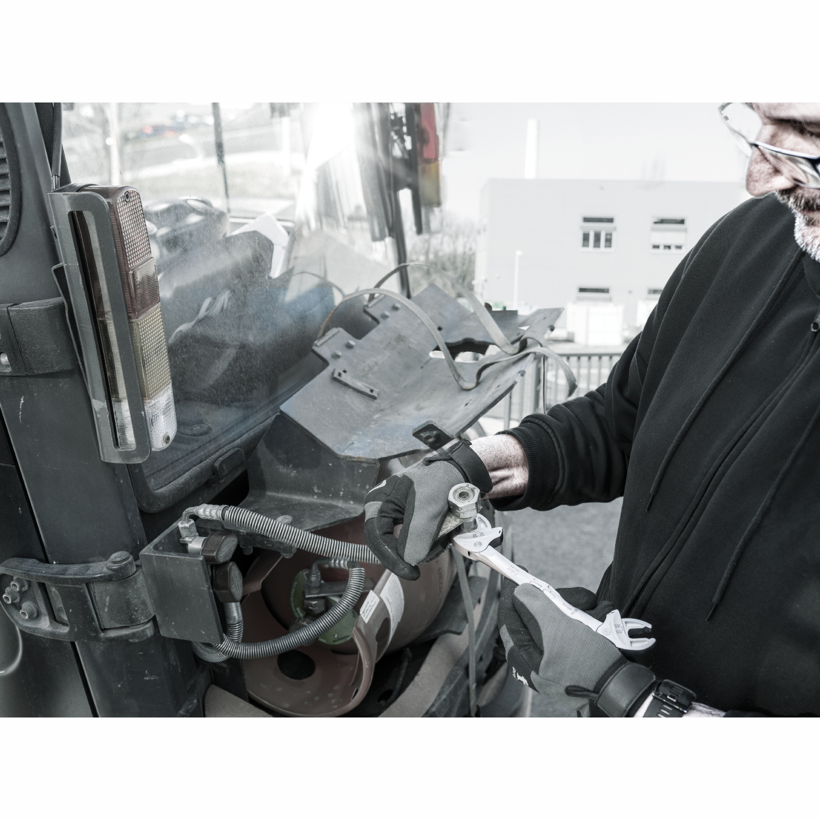 The ratchet functionality in both jaws of the double spanner allows for fast and consistent scredriving without removing the tool
