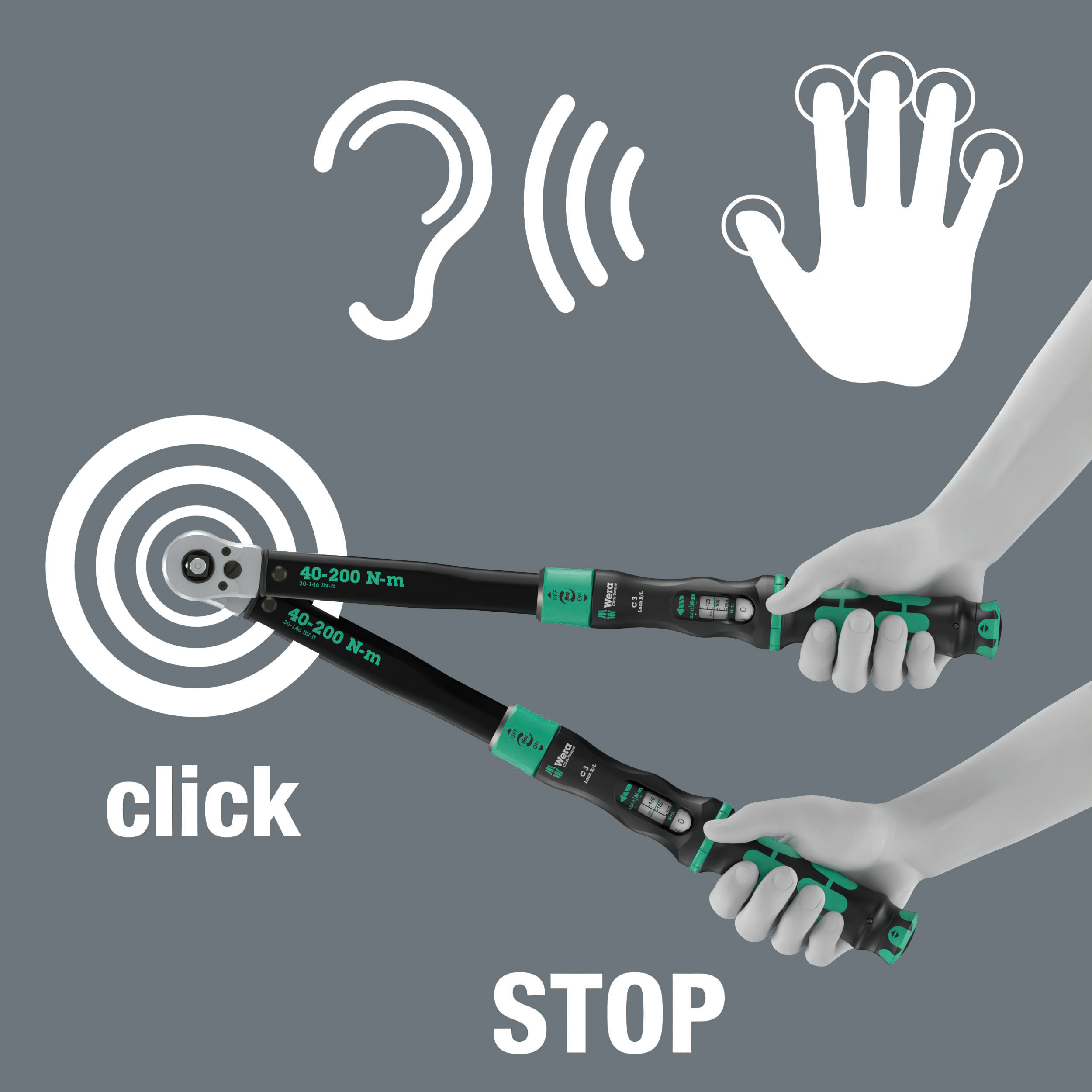 - Extra click: audible and tactile torque setting